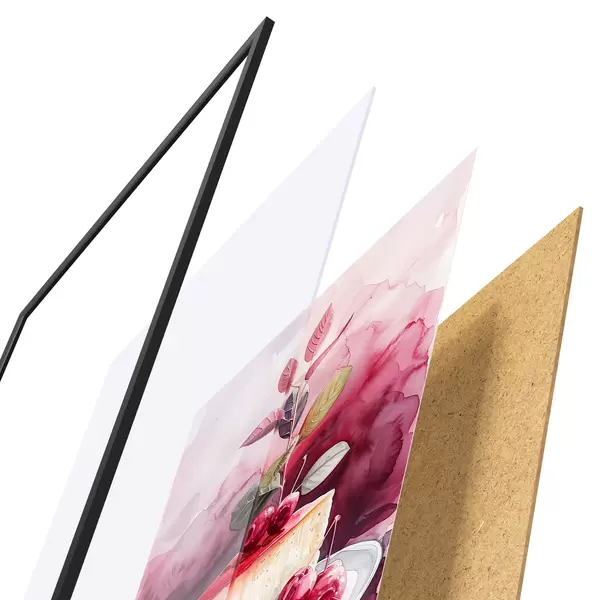 Das Poster besteht aus einem Rahmen, Plexiglas, einem gedruckten Bild und einer Rückwand aus Spanplatten. Dank der Halterungen auf der Rückseite kann das Poster sofort an die Wand gehängt werden.