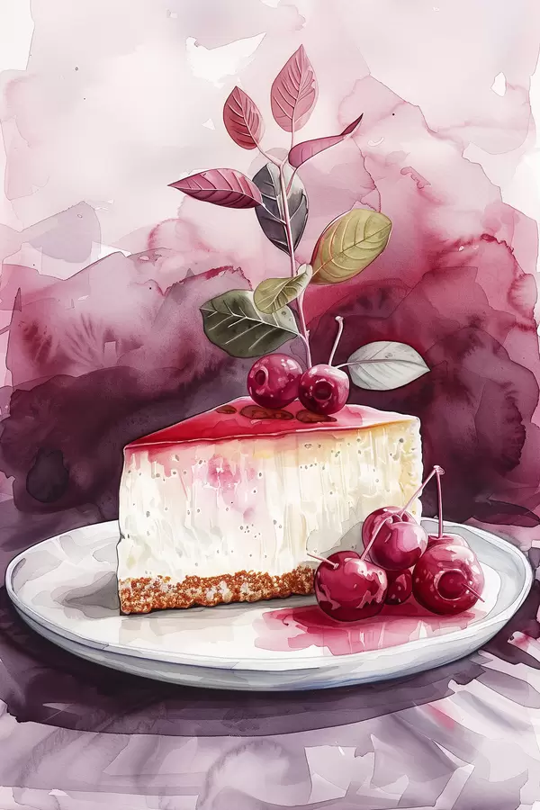 Poster Aquarell-Käsekuchen mit Kirschen, elegante Lebensmittelkunst, rote und violette Farben Nr f39700