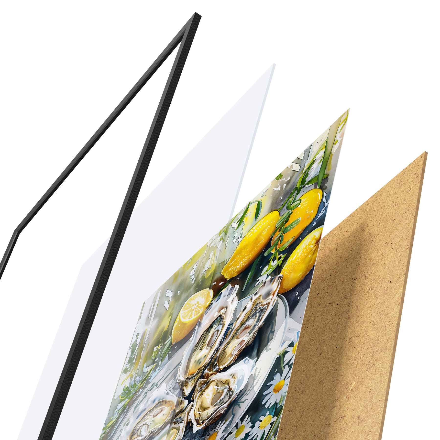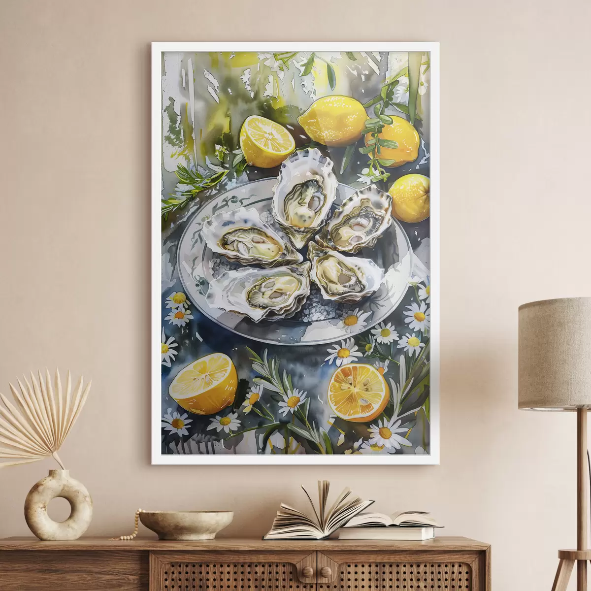 Poster Elegante Austern auf dem Teller, Zitronen und Blumen, Sommerfarben, mediterran Nr f39710