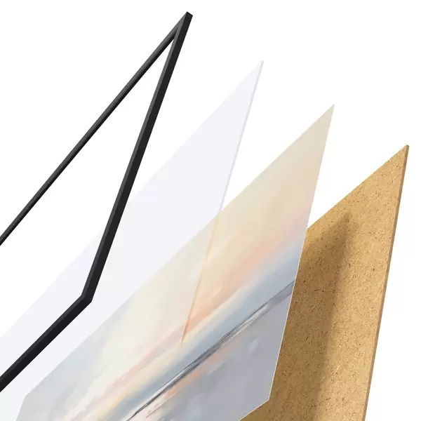 Das Poster besteht aus einem Rahmen, Plexiglas, einem gedruckten Bild und einer Rückwand aus Spanplatten. Dank der Halterungen auf der Rückseite kann das Poster sofort an die Wand gehängt werden.