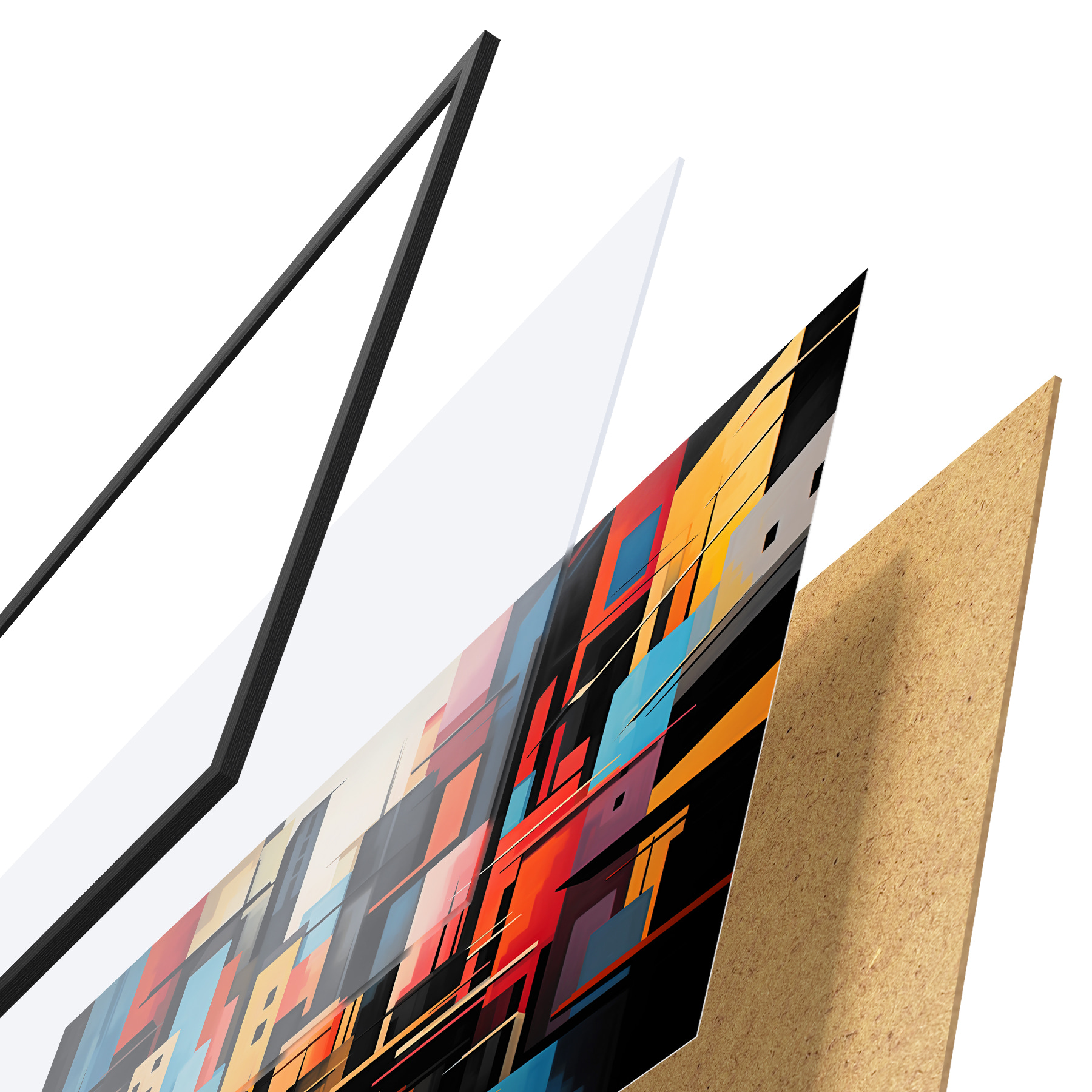 Das Poster besteht aus einem Rahmen, Plexiglas, einem gedruckten Bild und einer Rückwand aus Spanplatten. Dank der Halterungen auf der Rückseite kann das Poster sofort an die Wand gehängt werden.