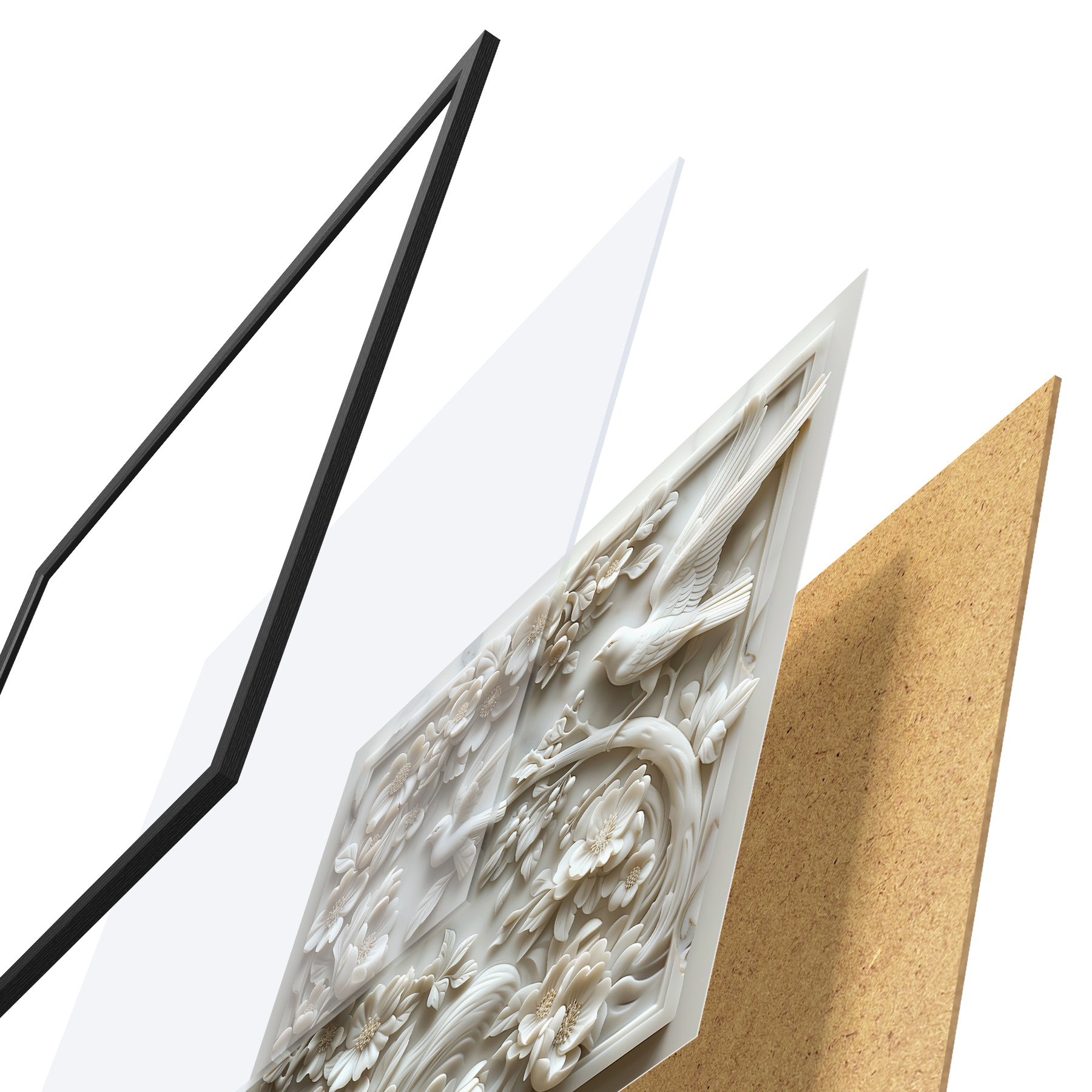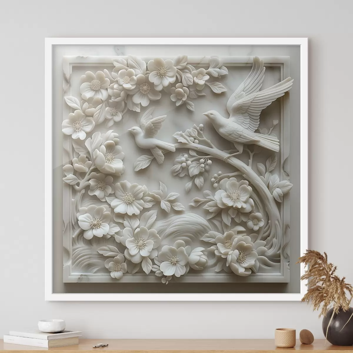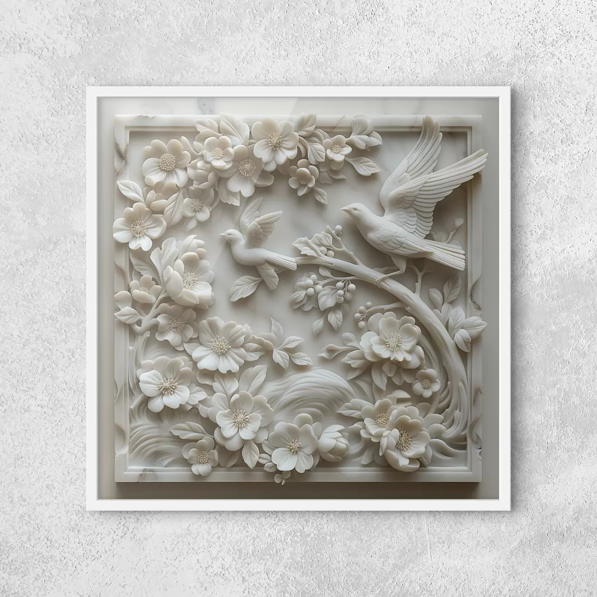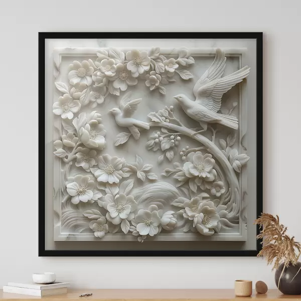 Poster Ein Garten aus weißem Marmor mit Reliefs von Vögeln und Blumen Nr f39728