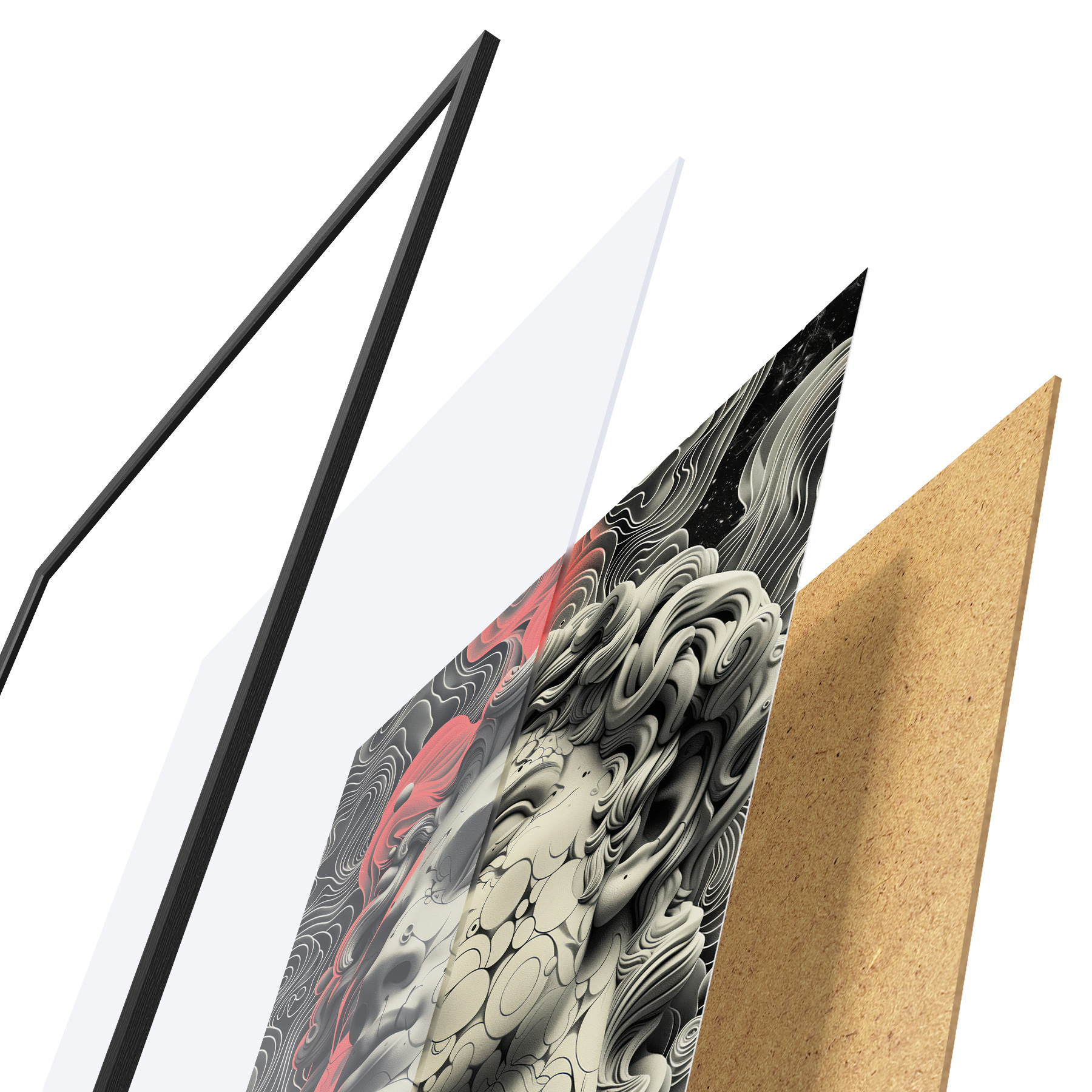 Das Poster besteht aus einem Rahmen, Plexiglas, einem gedruckten Bild und einer Rückwand aus Spanplatten. Dank der Halterungen auf der Rückseite kann das Poster sofort an die Wand gehängt werden.