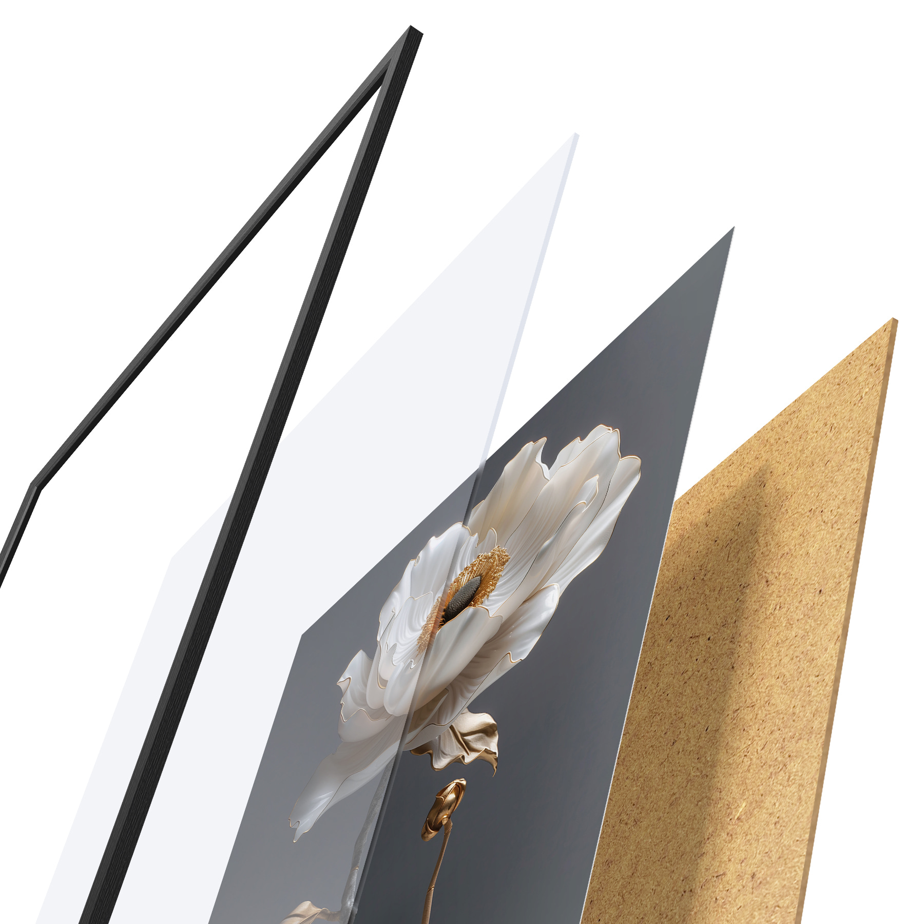 Das Poster besteht aus einem Rahmen, Plexiglas, einem gedruckten Bild und einer Rückwand aus Spanplatten. Dank der Halterungen auf der Rückseite kann das Poster sofort an die Wand gehängt werden.
