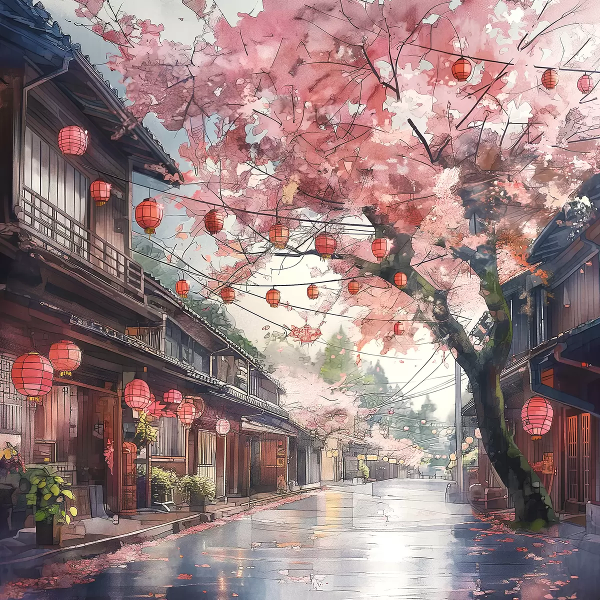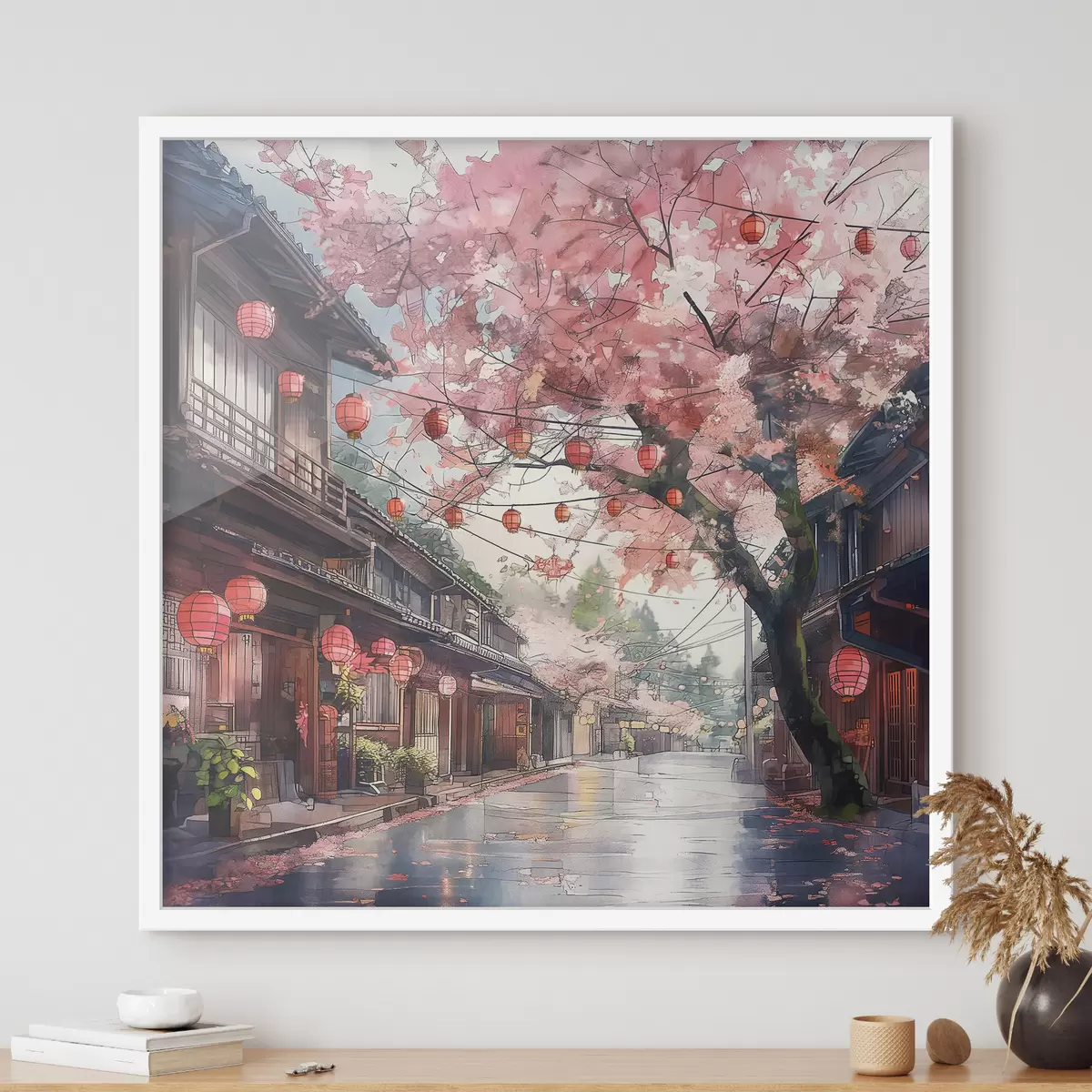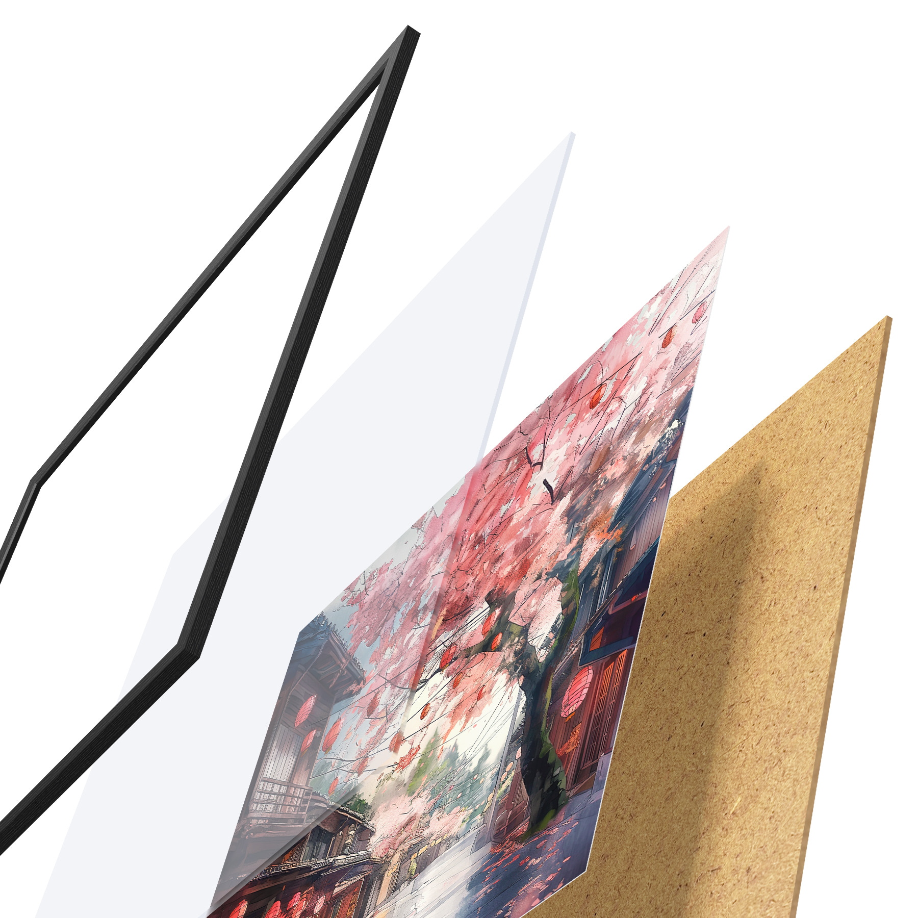 Poster Japanische Straße mit blühenden Kirschbäumen, orientalischer Architektur, Laternen f39774