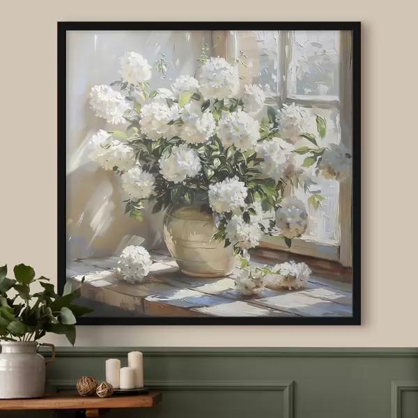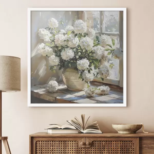 Poster Weiße Hortensien in der Vase, Sonnenlicht im Fenster, Ölgemälde Nr f39779