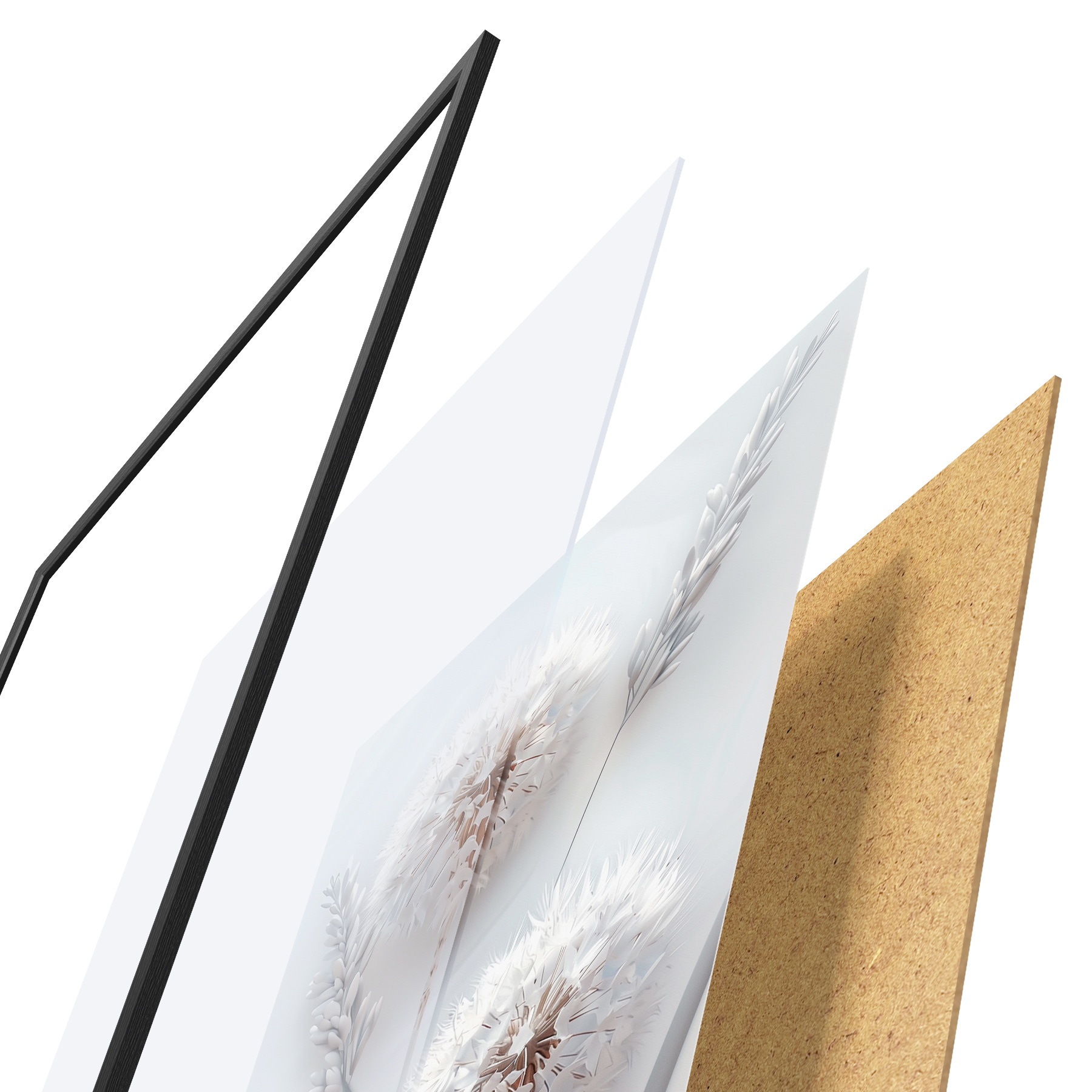 Das Poster besteht aus einem Rahmen, Plexiglas, einem gedruckten Bild und einer Rückwand aus Spanplatten. Dank der Halterungen auf der Rückseite kann das Poster sofort an die Wand gehängt werden.