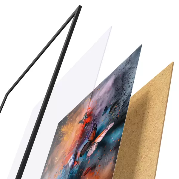 Das Poster besteht aus einem Rahmen, Plexiglas, einem gedruckten Bild und einer Rückwand aus Spanplatten. Dank der Halterungen auf der Rückseite kann das Poster sofort an die Wand gehängt werden.