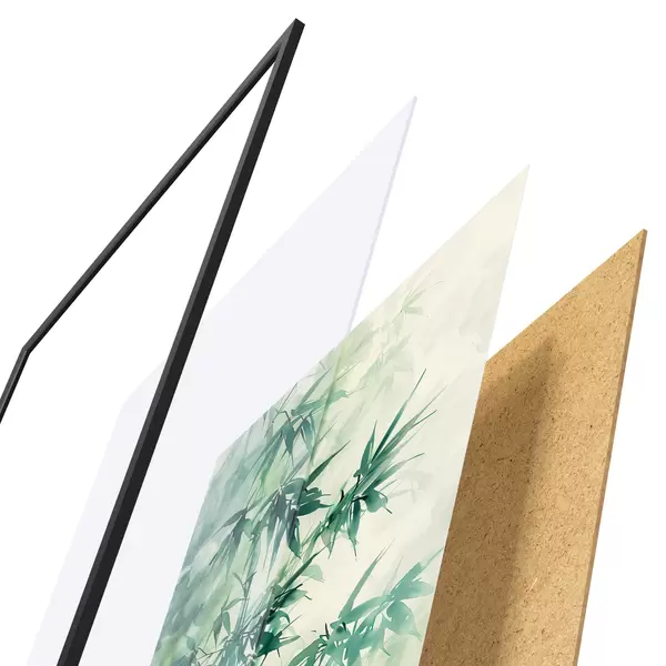 Das Poster besteht aus einem Rahmen, Plexiglas, einem gedruckten Bild und einer Rückwand aus Spanplatten. Dank der Halterungen auf der Rückseite kann das Poster sofort an die Wand gehängt werden.