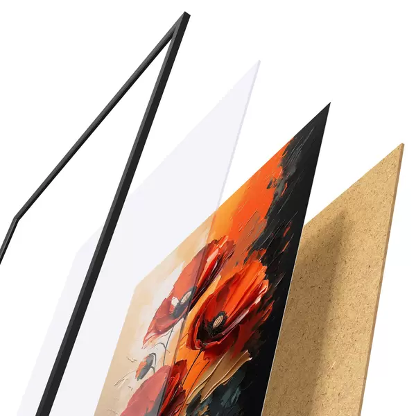 Das Poster besteht aus einem Rahmen, Plexiglas, einem gedruckten Bild und einer Rückwand aus Spanplatten. Dank der Halterungen auf der Rückseite kann das Poster sofort an die Wand gehängt werden.