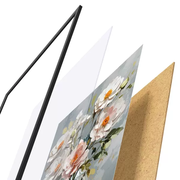 Das Poster besteht aus einem Rahmen, Plexiglas, einem gedruckten Bild und einer Rückwand aus Spanplatten. Dank der Halterungen auf der Rückseite kann das Poster sofort an die Wand gehängt werden.