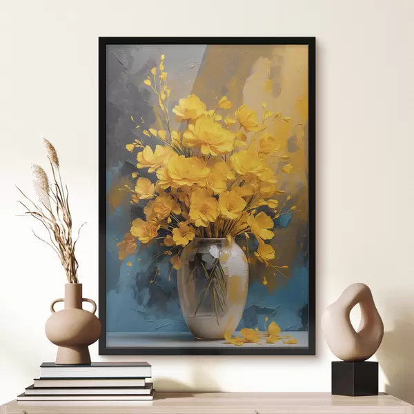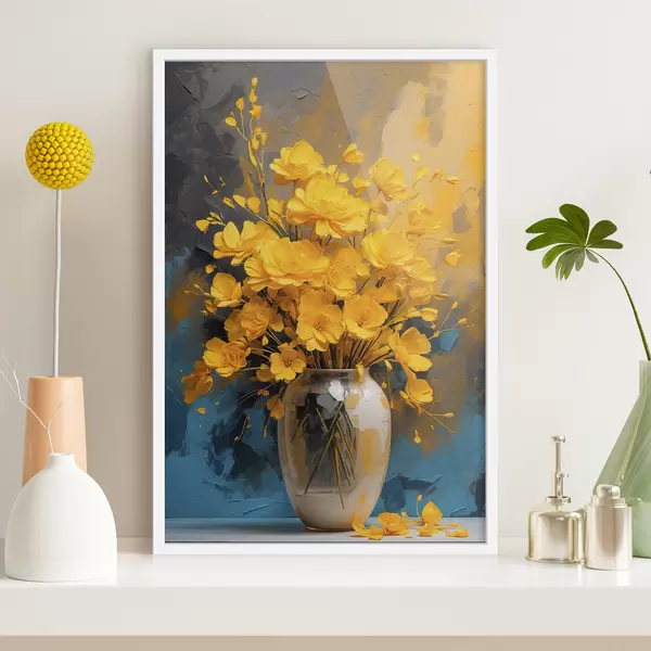 Poster Gelbe Blumen in der Vase auf buntem Acryl-Hintergrund f39854
