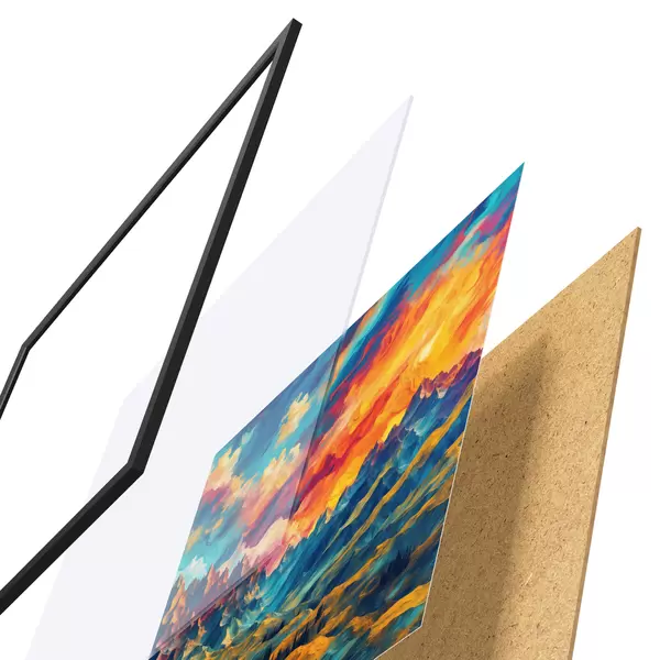 Das Poster besteht aus einem Rahmen, Plexiglas, einem gedruckten Bild und einer Rückwand aus Spanplatten. Dank der Halterungen auf der Rückseite kann das Poster sofort an die Wand gehängt werden.