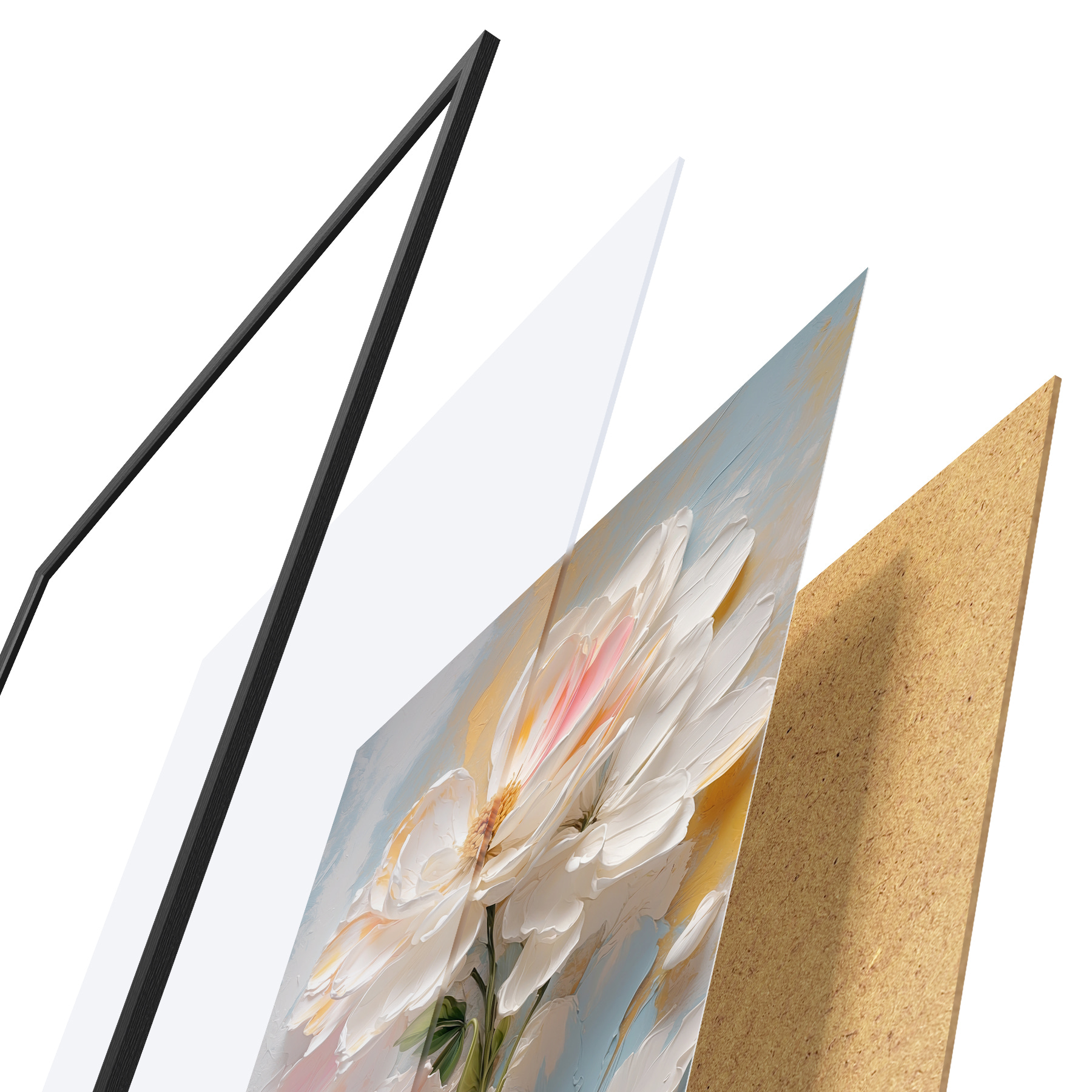 Das Poster besteht aus einem Rahmen, Plexiglas, einem gedruckten Bild und einer Rückwand aus Spanplatten. Dank der Halterungen auf der Rückseite kann das Poster sofort an die Wand gehängt werden.
