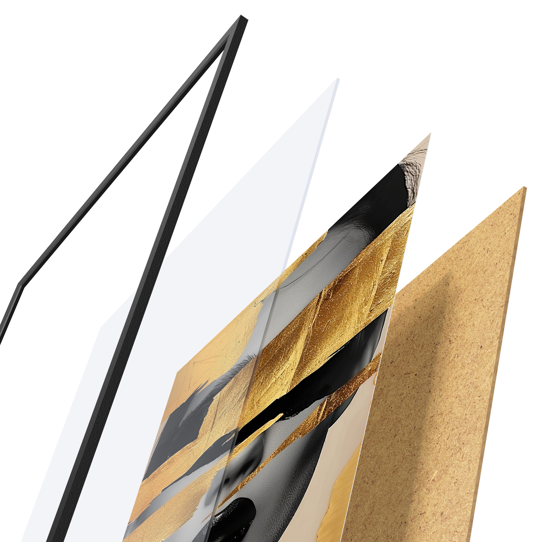 Das Poster besteht aus einem Rahmen, Plexiglas, einem gedruckten Bild und einer Rückwand aus Spanplatten. Dank der Halterungen auf der Rückseite kann das Poster sofort an die Wand gehängt werden.