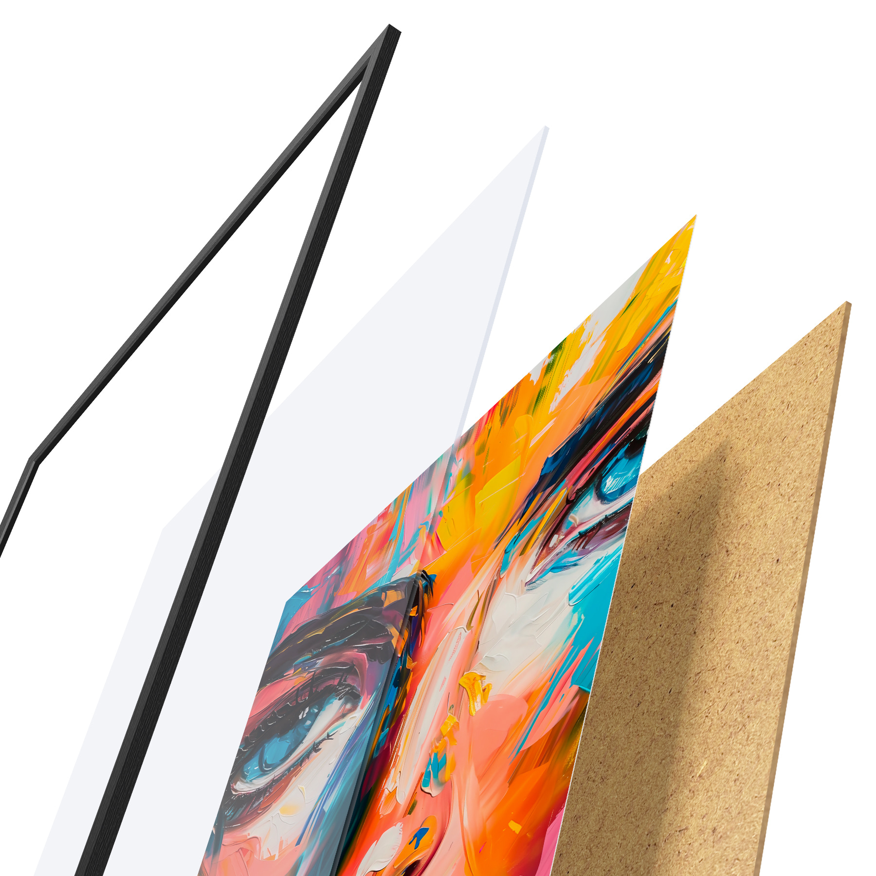 Das Poster besteht aus einem Rahmen, Plexiglas, einem gedruckten Bild und einer Rückwand aus Spanplatten. Dank der Halterungen auf der Rückseite kann das Poster sofort an die Wand gehängt werden.