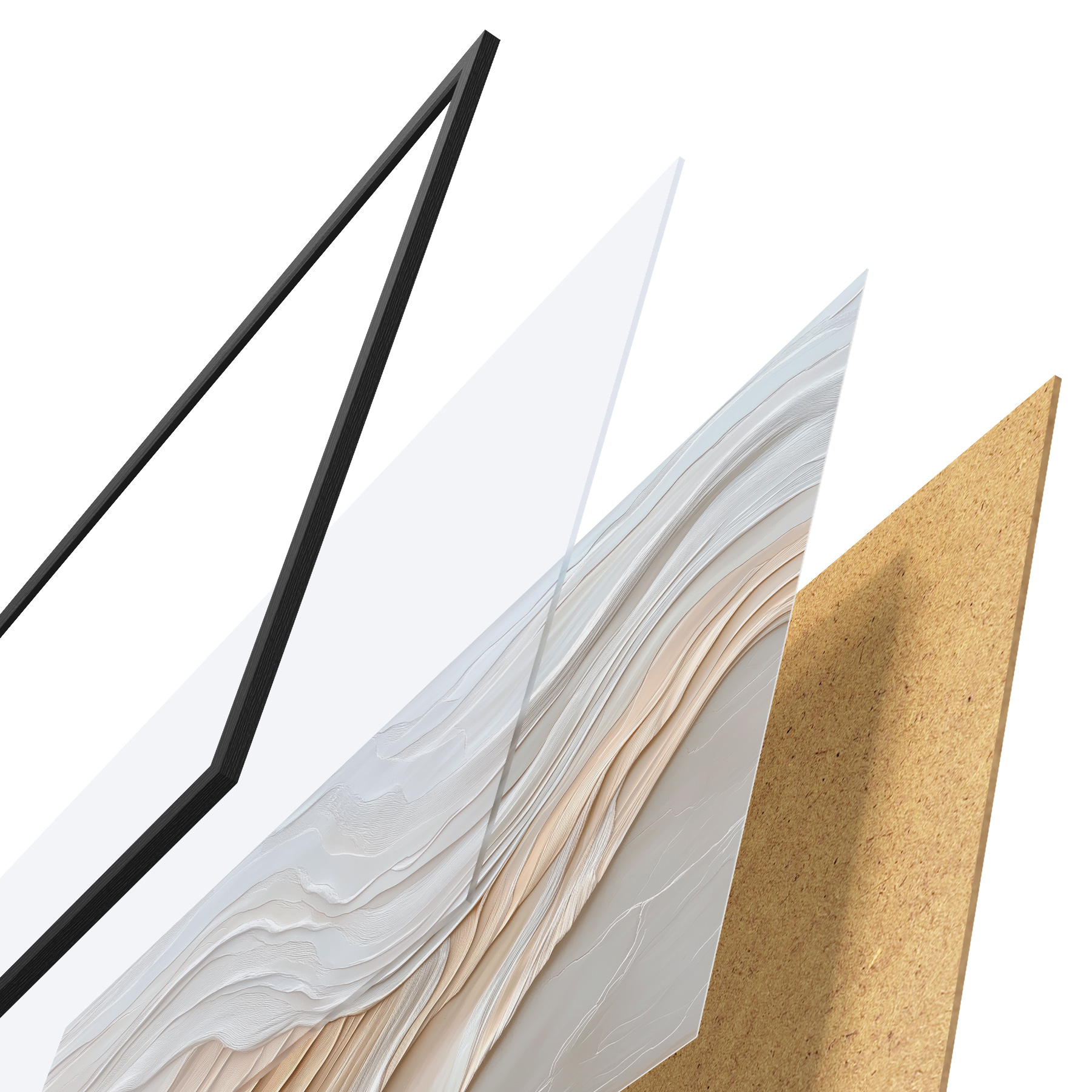 Das Poster besteht aus einem Rahmen, Plexiglas, einem gedruckten Bild und einer Rückwand aus Spanplatten. Dank der Halterungen auf der Rückseite kann das Poster sofort an die Wand gehängt werden.