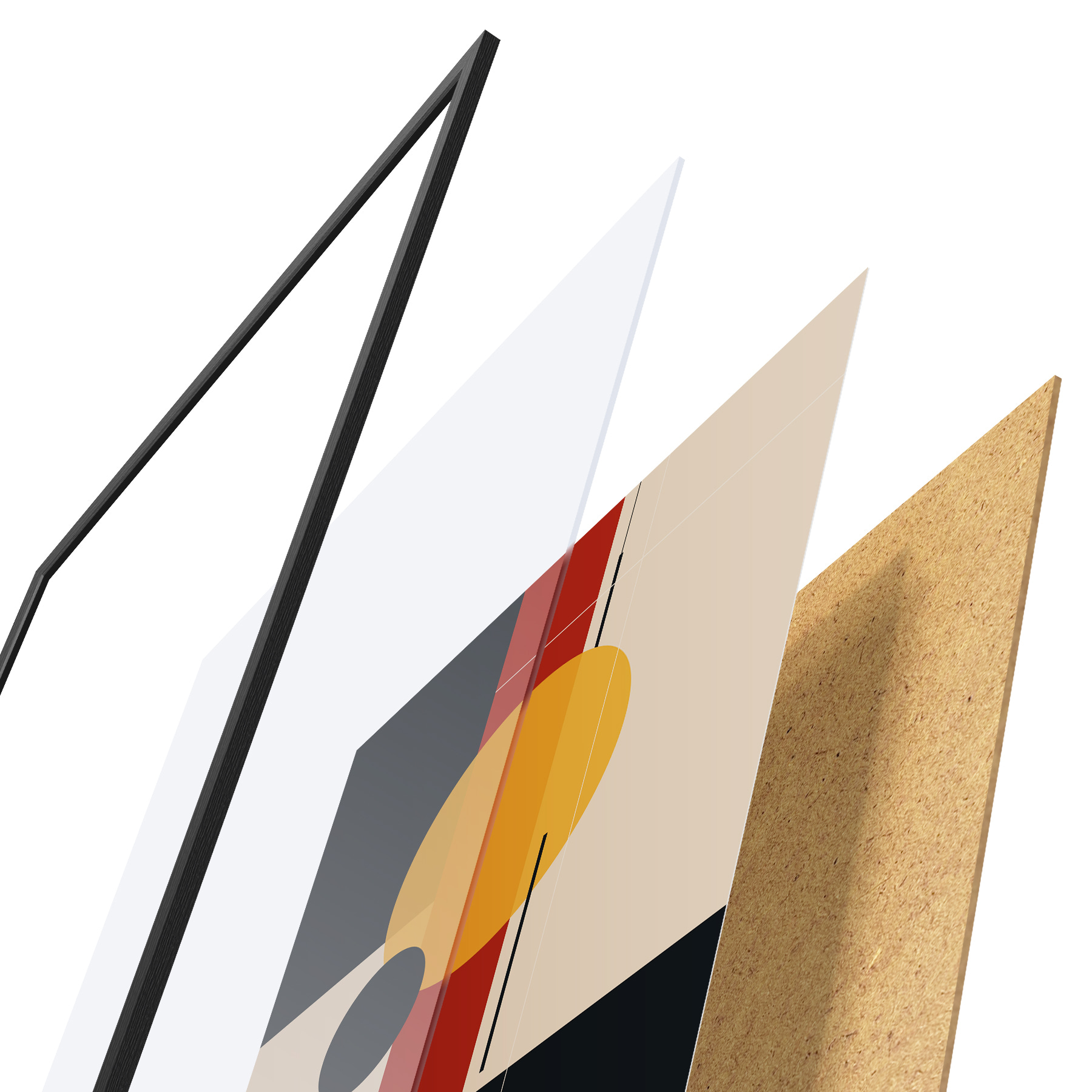 Das Poster besteht aus einem Rahmen, Plexiglas, einem gedruckten Bild und einer Rückwand aus Spanplatten. Dank der Halterungen auf der Rückseite kann das Poster sofort an die Wand gehängt werden.