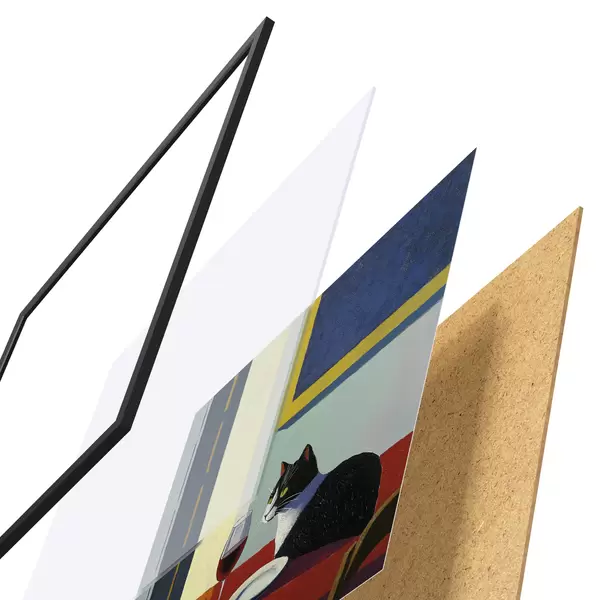 Das Poster besteht aus einem Rahmen, Plexiglas, einem gedruckten Bild und einer Rückwand aus Spanplatten. Dank der Halterungen auf der Rückseite kann das Poster sofort an die Wand gehängt werden.