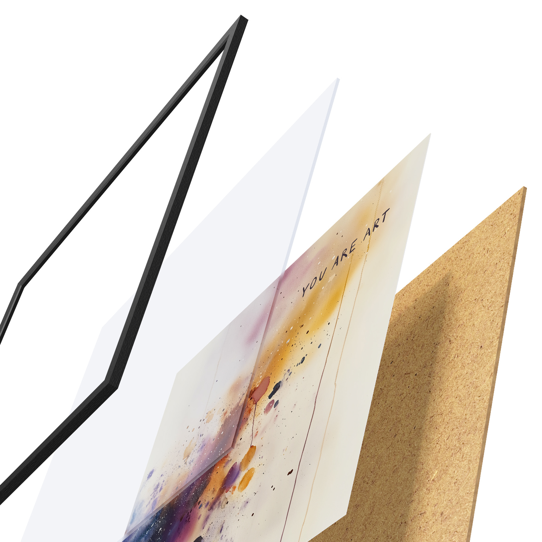 Das Poster besteht aus einem Rahmen, Plexiglas, einem gedruckten Bild und einer Rückwand aus Spanplatten. Dank der Halterungen auf der Rückseite kann das Poster sofort an die Wand gehängt werden.