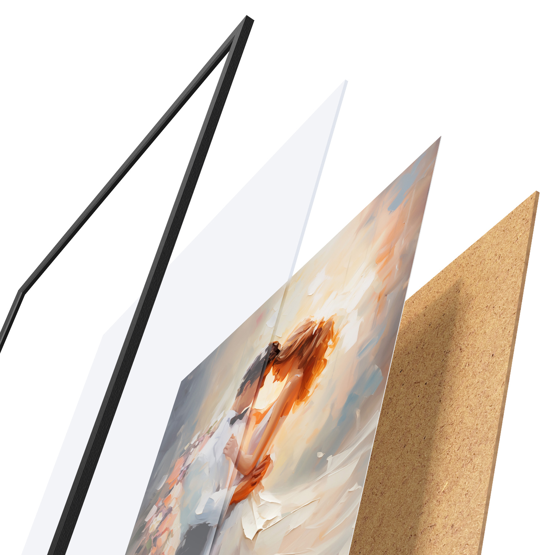 Das Poster besteht aus einem Rahmen, Plexiglas, einem gedruckten Bild und einer Rückwand aus Spanplatten. Dank der Halterungen auf der Rückseite kann das Poster sofort an die Wand gehängt werden.