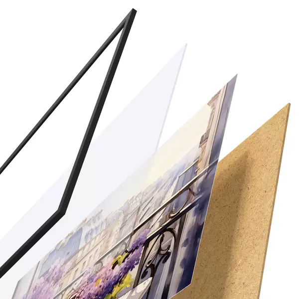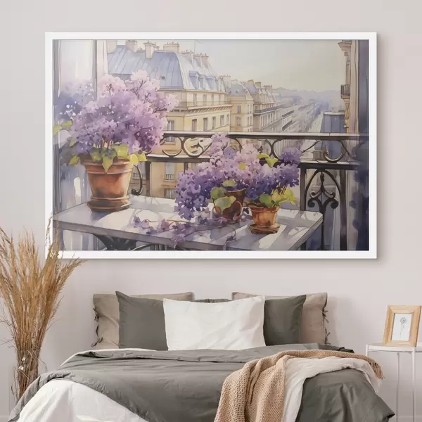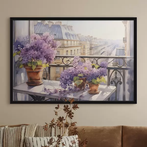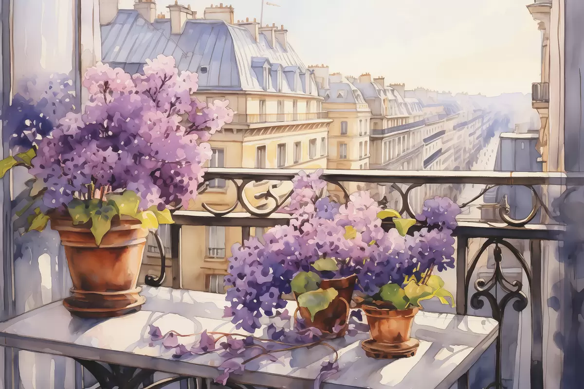 Poster Veilchen in einem Topf auf einem Balkon in Paris Aquarell f39931