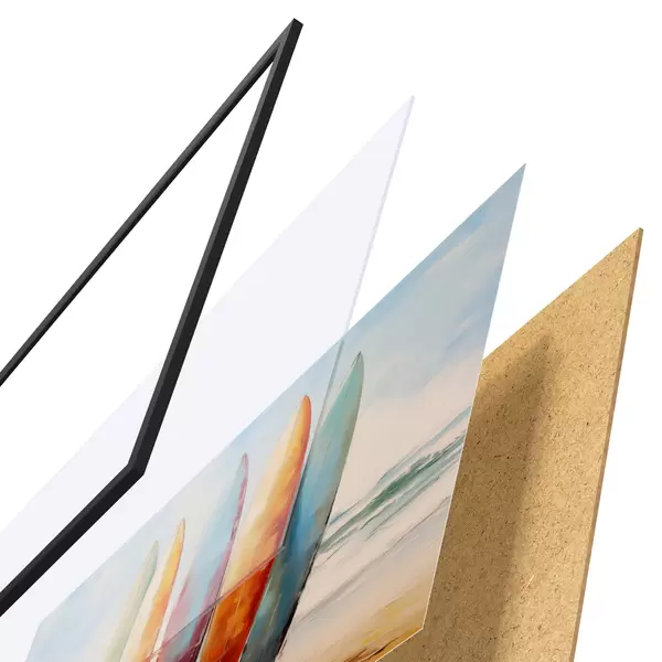 Das Poster besteht aus einem Rahmen, Plexiglas, einem gedruckten Bild und einer Rückwand aus Spanplatten. Dank der Halterungen auf der Rückseite kann das Poster sofort an die Wand gehängt werden.