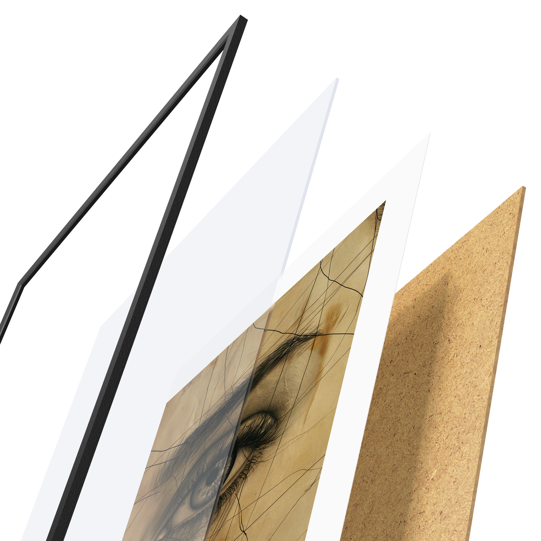 Das Poster besteht aus einem Rahmen, Plexiglas, einem gedruckten Bild und einer Rückwand aus Spanplatten. Dank der Halterungen auf der Rückseite kann das Poster sofort an die Wand gehängt werden.