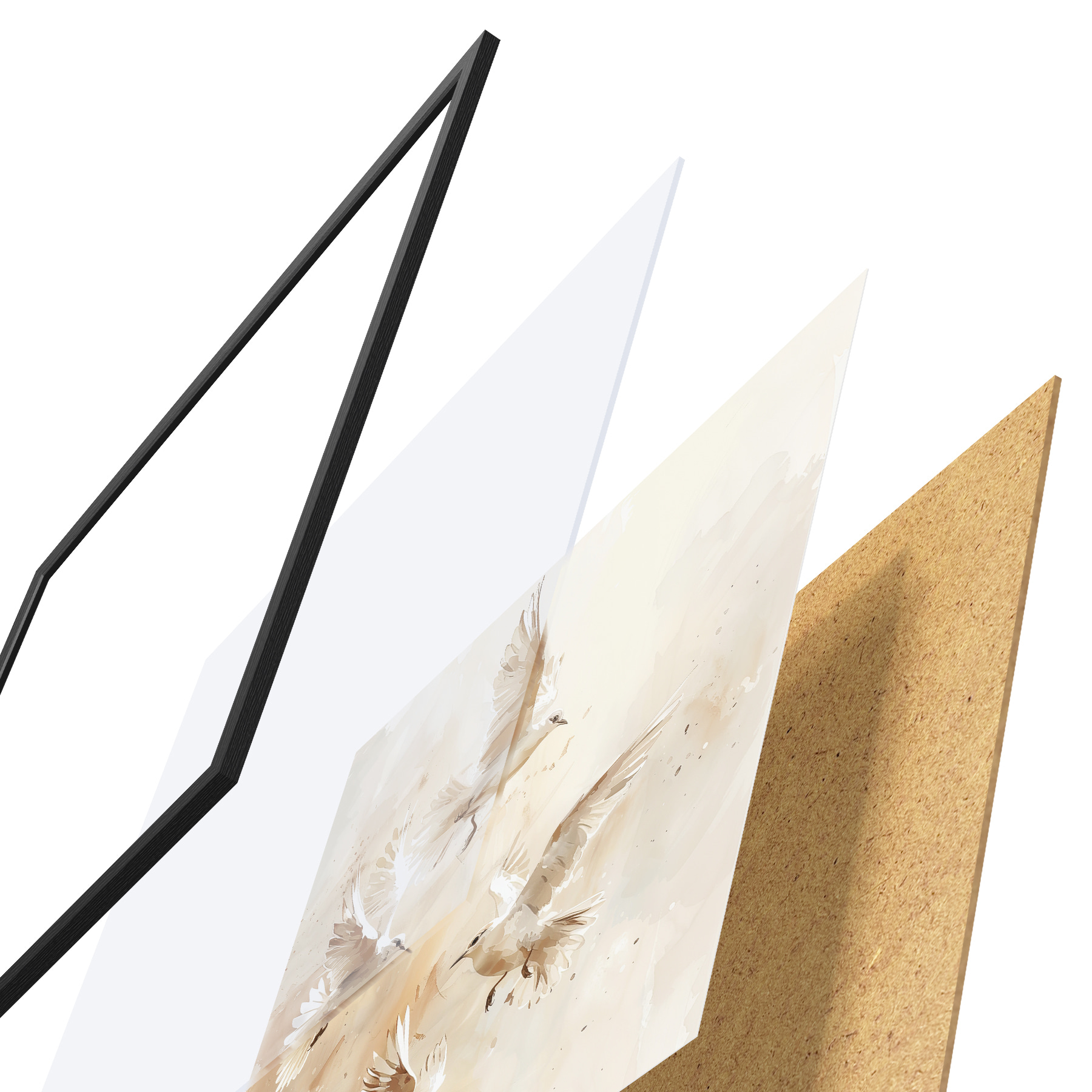 Das Poster besteht aus einem Rahmen, Plexiglas, einem gedruckten Bild und einer Rückwand aus Spanplatten. Dank der Halterungen auf der Rückseite kann das Poster sofort an die Wand gehängt werden.