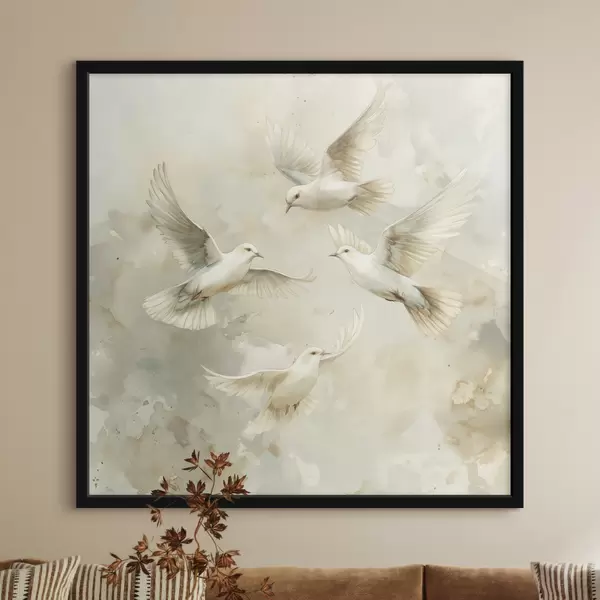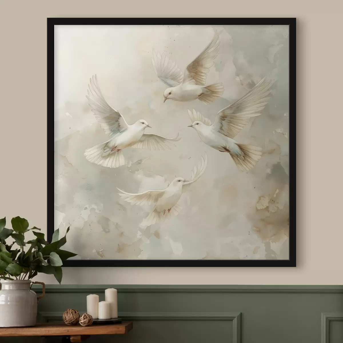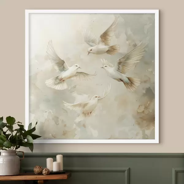 Poster Aquarell fliegende Vögel, zarte beige und weiße Farben, Tauben f39976