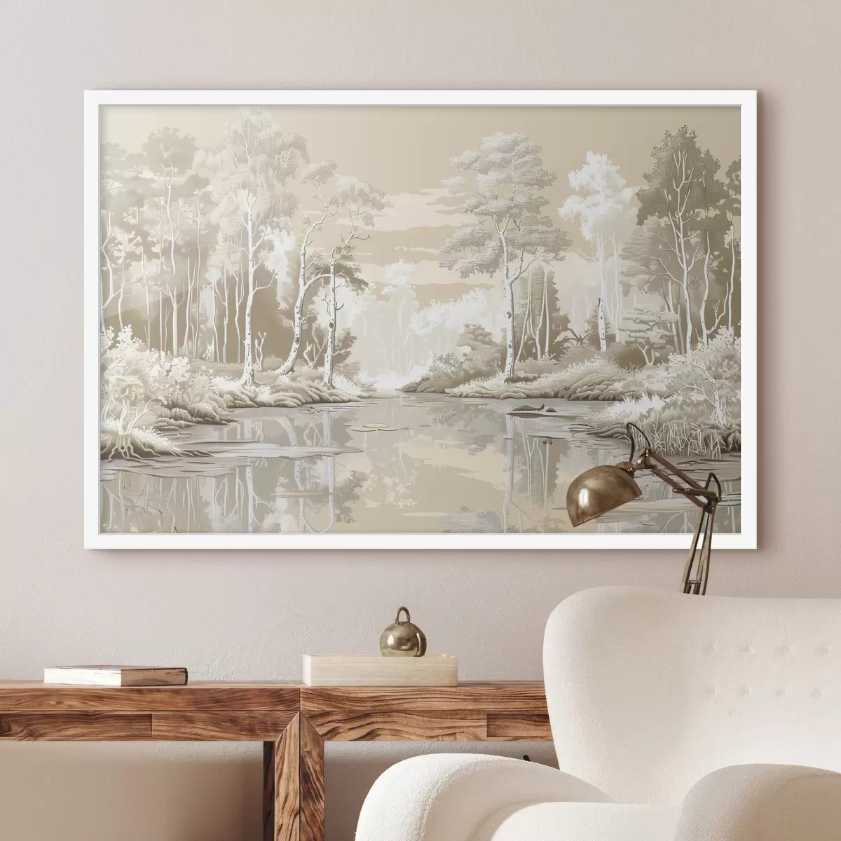 Poster Wunderschöne Waldlandschaft, sanfte Pastellfarben, Beige und Weiß f39978