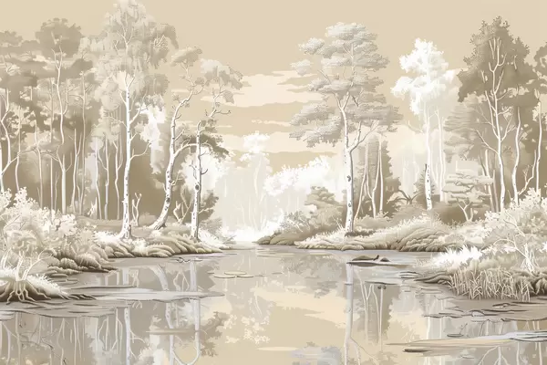Poster Wunderschöne Waldlandschaft, sanfte Pastellfarben, Beige und Weiß f39978