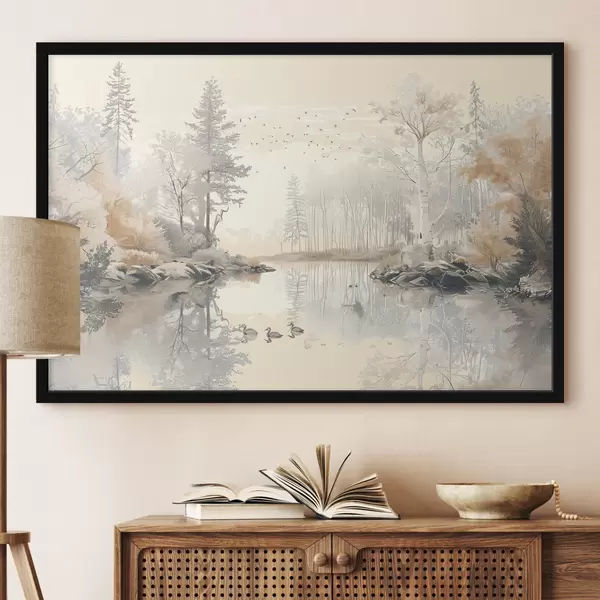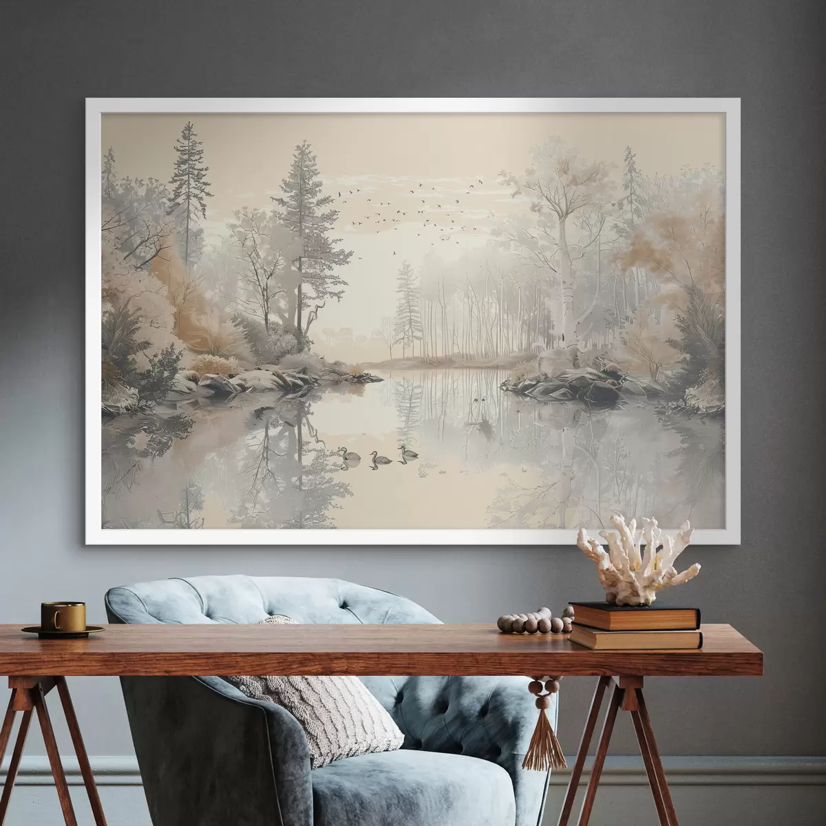 Poster Wunderschöne Naturlandschaft, Teich und Bäume, Tierwelt, sanfte Pastellfarben f39980