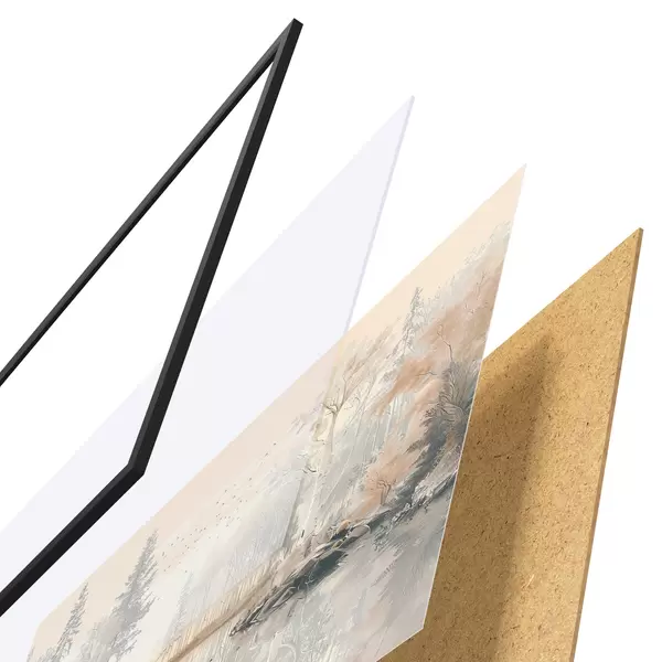 Das Poster besteht aus einem Rahmen, Plexiglas, einem gedruckten Bild und einer Rückwand aus Spanplatten. Dank der Halterungen auf der Rückseite kann das Poster sofort an die Wand gehängt werden.