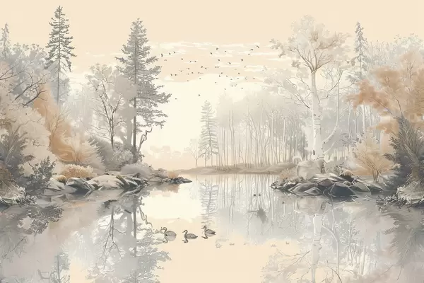 Poster Wunderschöne Naturlandschaft, Teich und Bäume, Tierwelt, sanfte Pastellfarben f39980