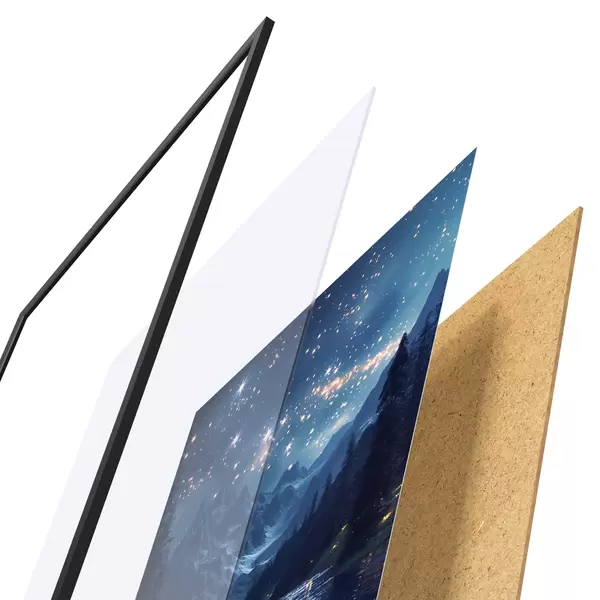 Das Poster besteht aus einem Rahmen, Plexiglas, einem gedruckten Bild und einer Rückwand aus Spanplatten. Dank der Halterungen auf der Rückseite kann das Poster sofort an die Wand gehängt werden.