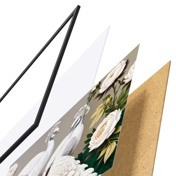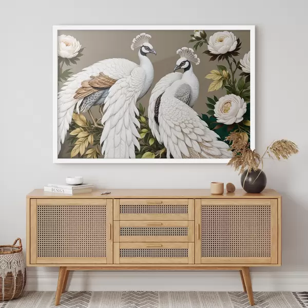 Poster Zwei weiße Pfauen mit verzierten Federn sitzen auf einem Ast mit Blumen Nr f40022