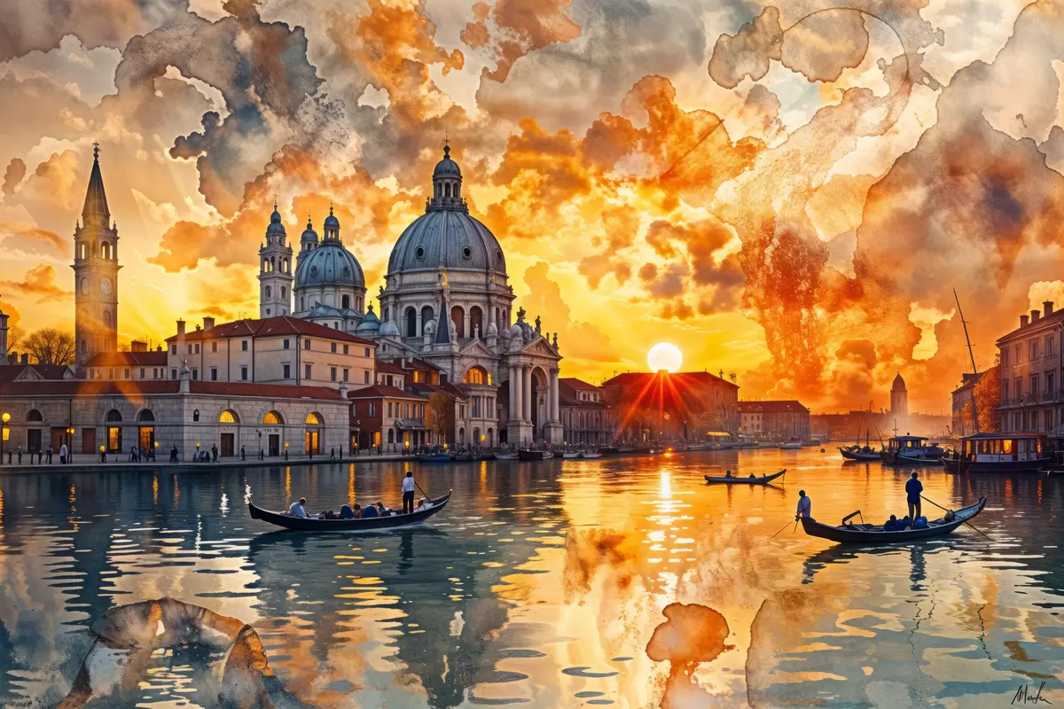 Poster Ein farbenfroher und dramatischer Sonnenuntergang über dem Canale Grande in Venedig, Italien, Aquarellkunst f40027