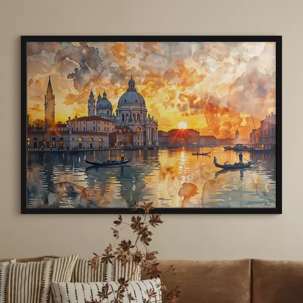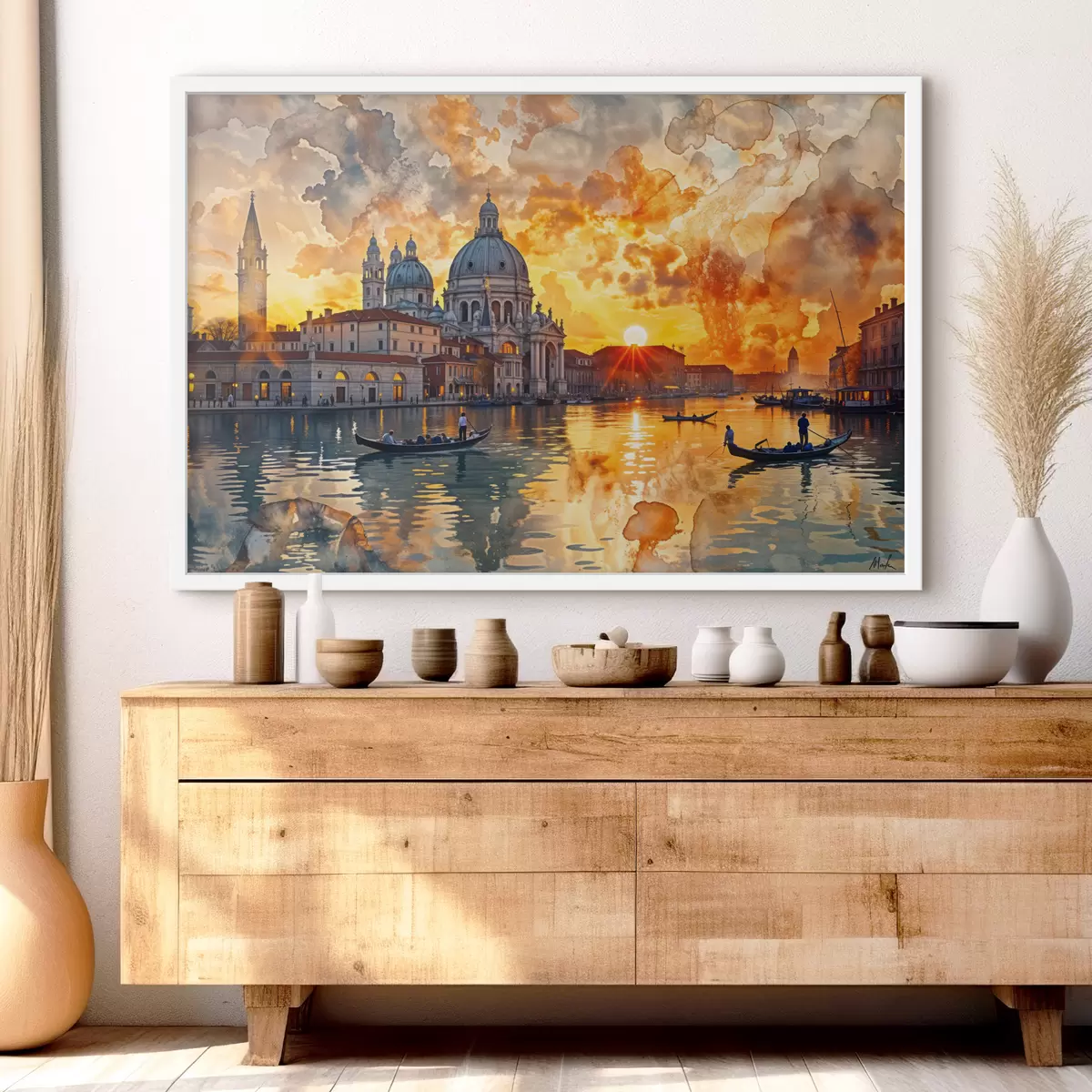 Poster Ein farbenfroher und dramatischer Sonnenuntergang über dem Canale Grande in Venedig, Italien, Aquarellkunst Nr f40027