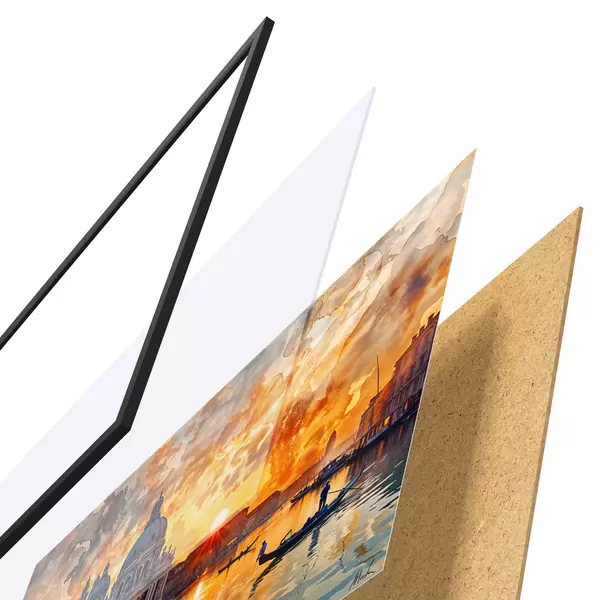 Das Poster besteht aus einem Rahmen, Plexiglas, einem gedruckten Bild und einer Rückwand aus Spanplatten. Dank der Halterungen auf der Rückseite kann das Poster sofort an die Wand gehängt werden.