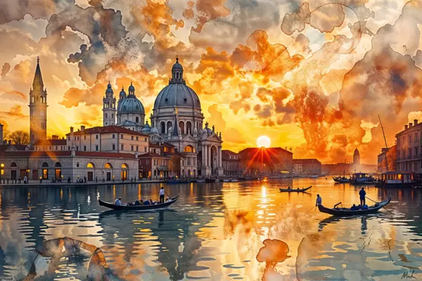 Poster Ein farbenfroher und dramatischer Sonnenuntergang über dem Canale Grande in Venedig, Italien, Aquarellkunst Nr f40027