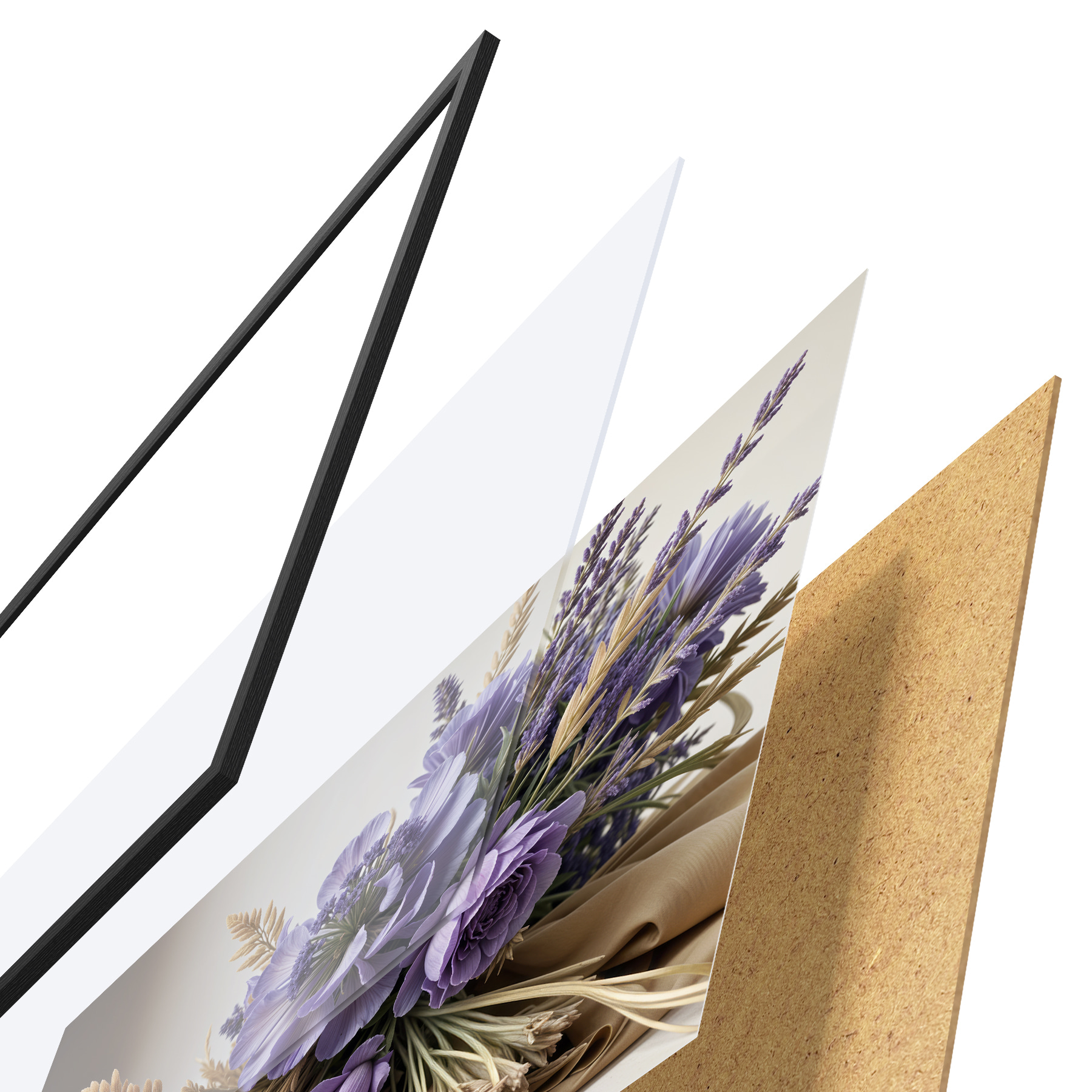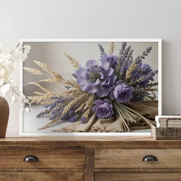 Poster Ein Strauß violetter Blumen, darunter Pfingstrosen und Lavendel, mit Weizenhalmen auf hellem Hintergrund Nr f40030