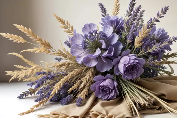 Poster Ein Strauß violetter Blumen, darunter Pfingstrosen und Lavendel, mit Weizenhalmen auf hellem Hintergrund Nr f40030