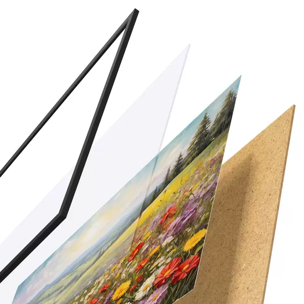 Das Poster besteht aus einem Rahmen, Plexiglas, einem gedruckten Bild und einer Rückwand aus Spanplatten. Dank der Halterungen auf der Rückseite kann das Poster sofort an die Wand gehängt werden.