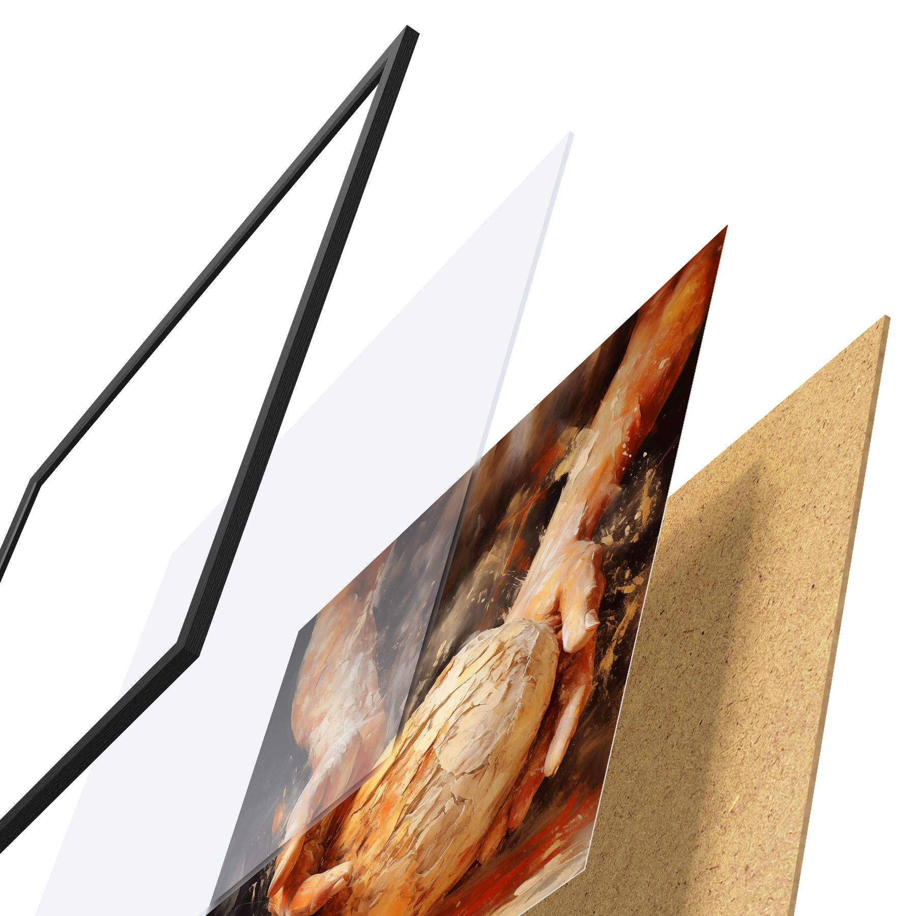 Das Poster besteht aus einem Rahmen, Plexiglas, einem gedruckten Bild und einer Rückwand aus Spanplatten. Dank der Halterungen auf der Rückseite kann das Poster sofort an die Wand gehängt werden.