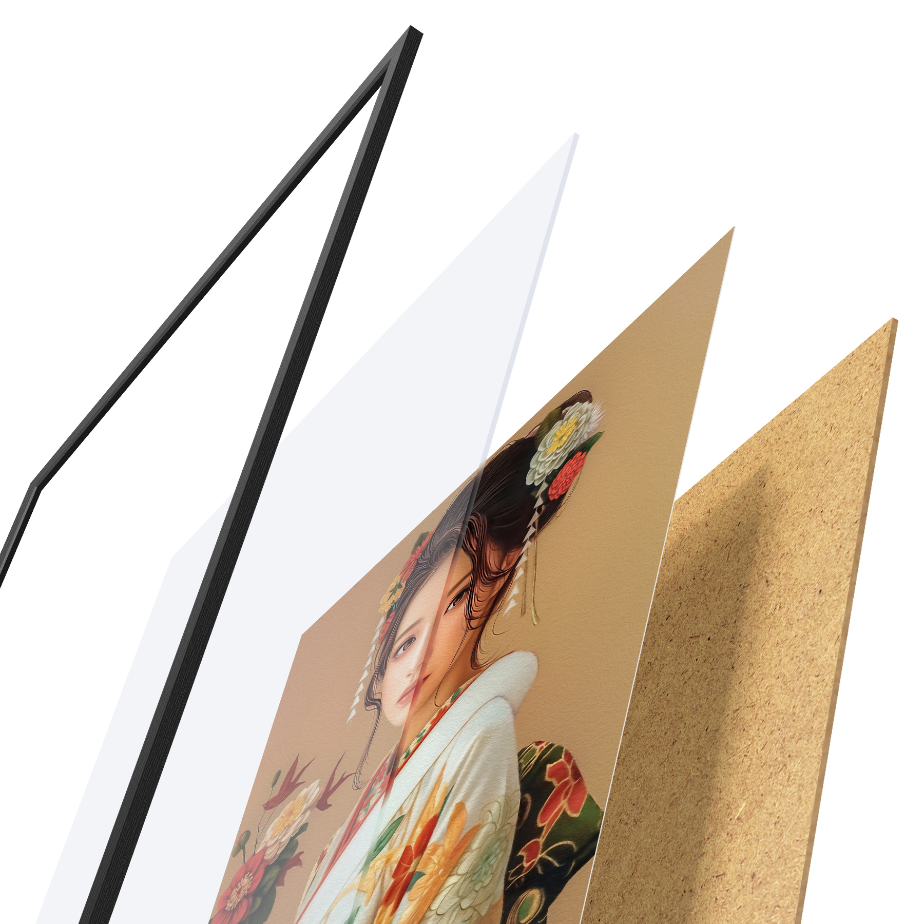Das Poster besteht aus einem Rahmen, Plexiglas, einem gedruckten Bild und einer Rückwand aus Spanplatten. Dank der Halterungen auf der Rückseite kann das Poster sofort an die Wand gehängt werden.