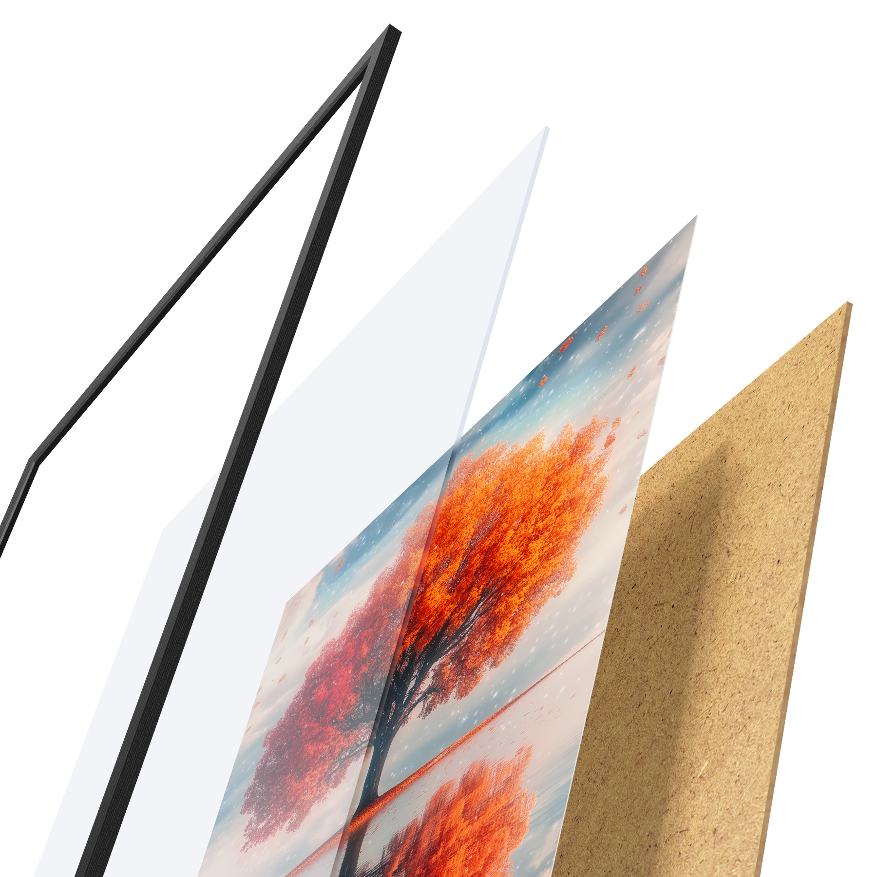 Das Poster besteht aus einem Rahmen, Plexiglas, einem gedruckten Bild und einer Rückwand aus Spanplatten. Dank der Halterungen auf der Rückseite kann das Poster sofort an die Wand gehängt werden.