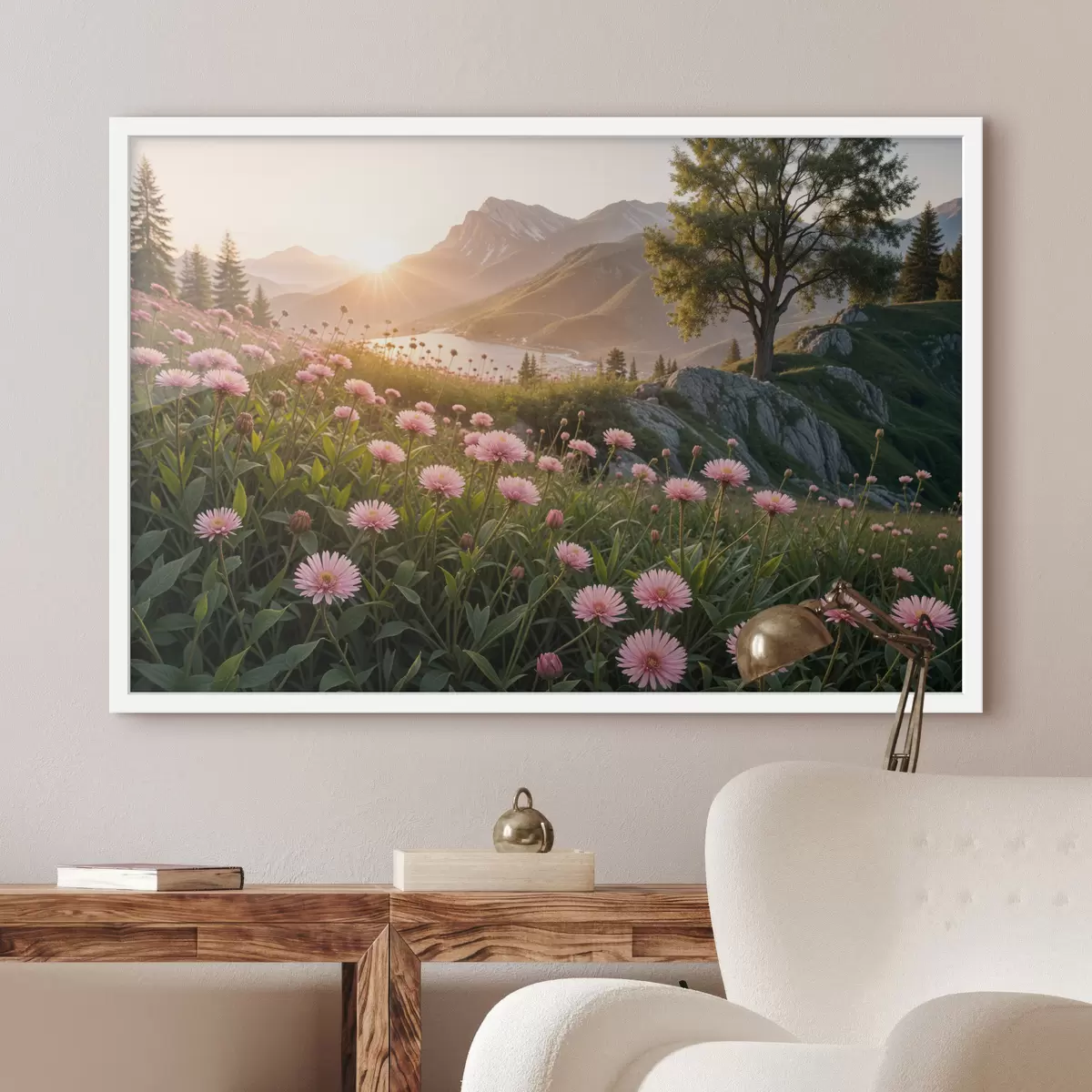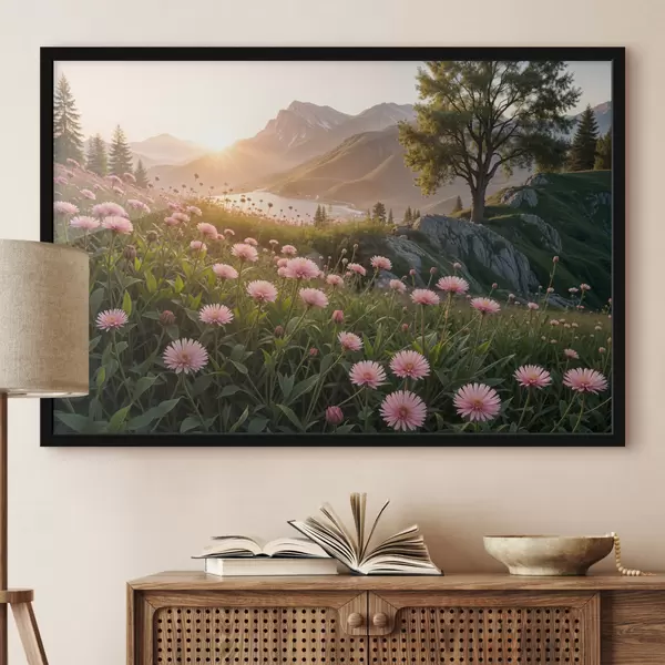 Poster Ein Feld mit rosa Gänseblümchen-ähnlichen Blumen im Vordergrund, mit einer großen Bergkette im Hintergrund f40154