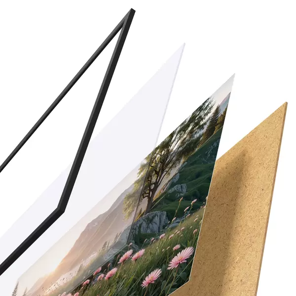 Das Poster besteht aus einem Rahmen, Plexiglas, einem gedruckten Bild und einer Rückwand aus Spanplatten. Dank der Halterungen auf der Rückseite kann das Poster sofort an die Wand gehängt werden.