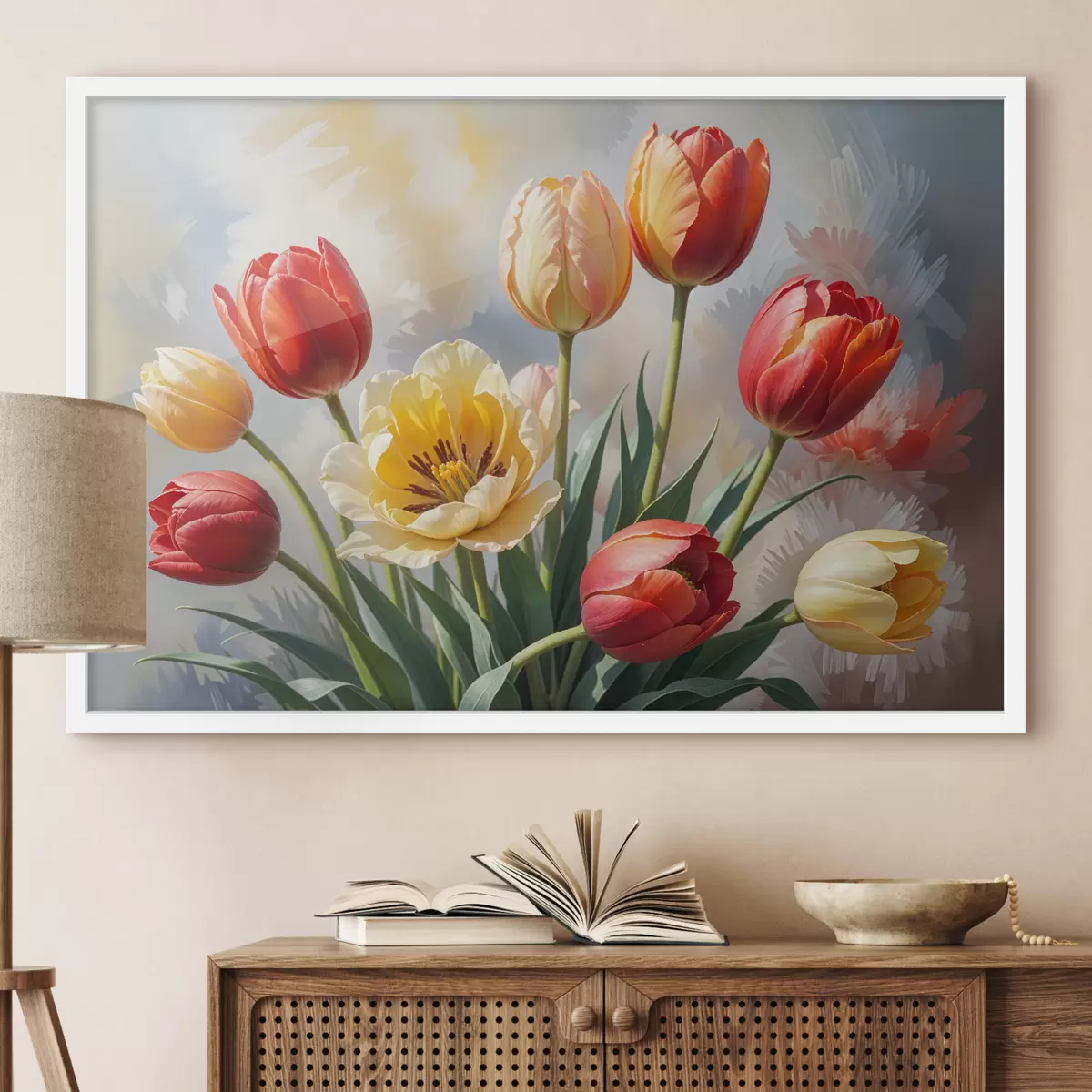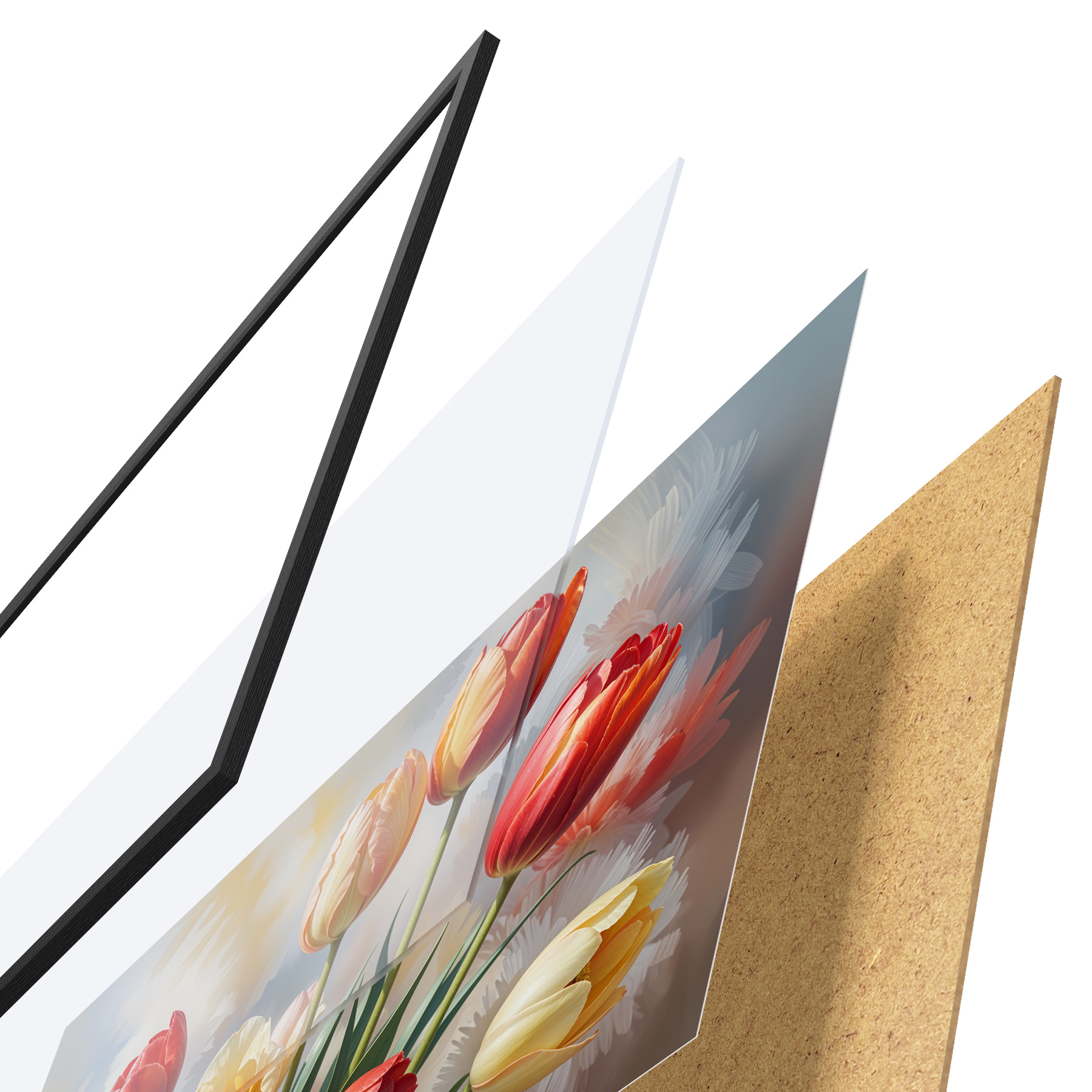 Poster Bunte Tulpen in verschiedenen Rot-, Orange- und Gelbtönen vor hellem Hintergrund f40167